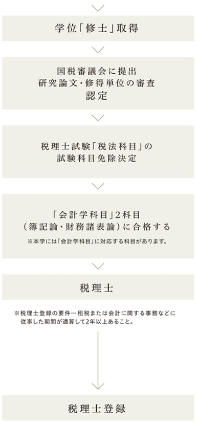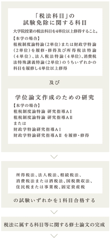 税理士試験「税法」に属する科目の免除申請が可能 大学院経済学研究科博士課程前期課程では、学位取得により、平成14年4月施行の改正税理士法に基づき、 税理士試験「税法」に属する科目の一部免除を受けることができます。 (詳細は国税庁ホームページをご確認ください)