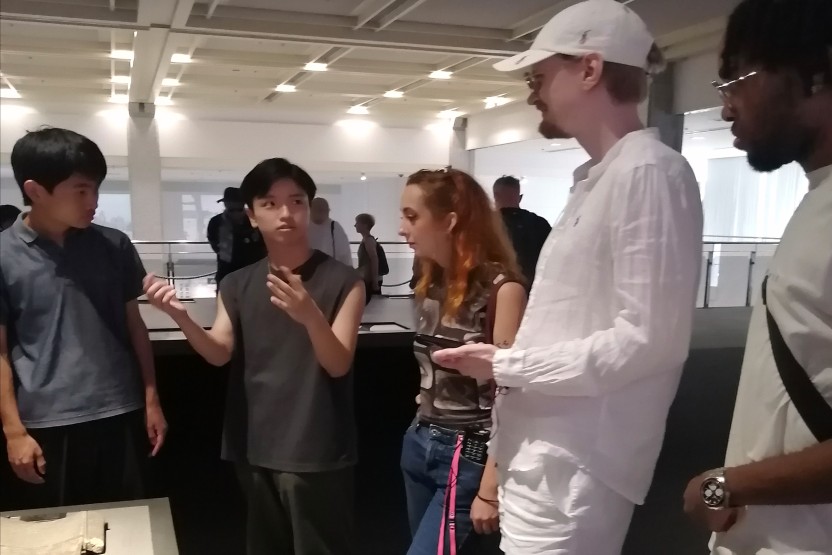 After that, the group visited the museum exhibits together with Japanese students. The students seriously viewed the displays and exhibits that conveyed the reality of the atomic bomb damage. Next, the group divided into small groups, and the Japanese students guided the exchange students in English around various parts of the Peace Park.