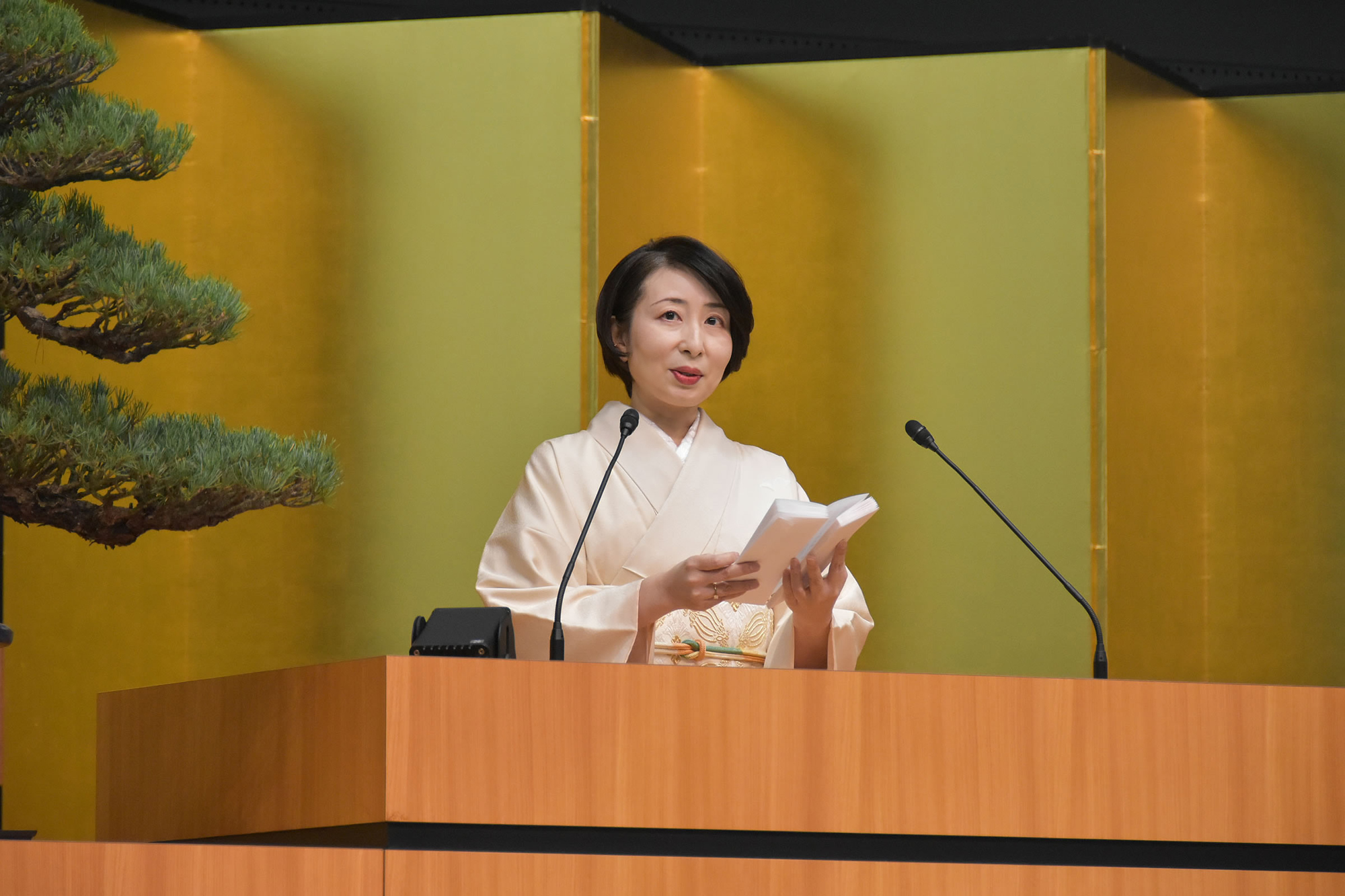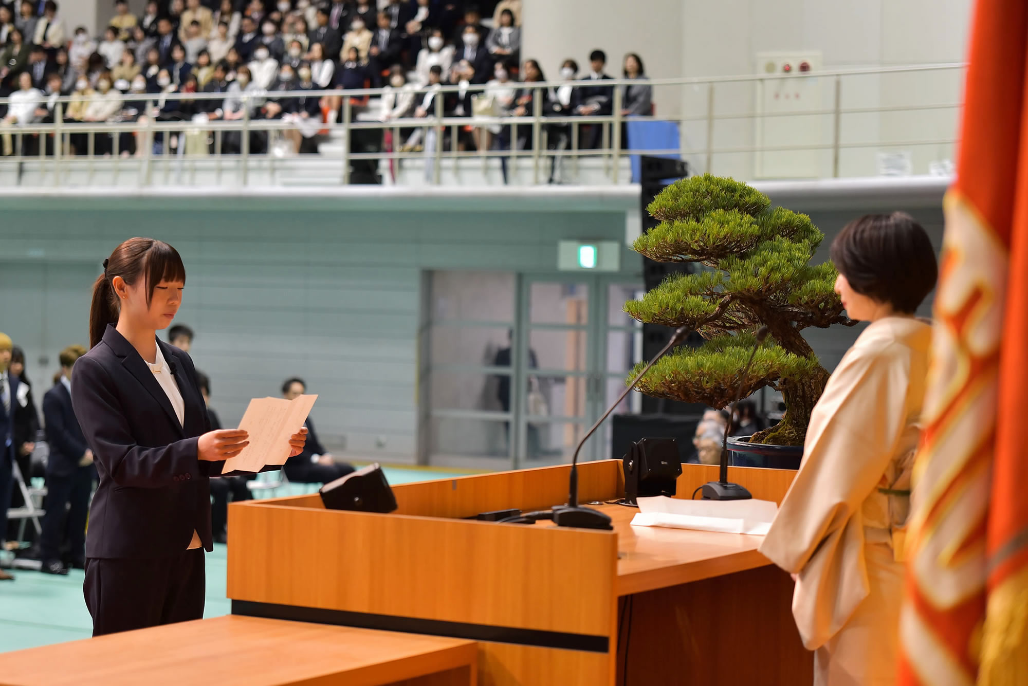 Sakina Yamakawa (Department of Sports Management, School of Business Administration), representing the entering undergraduate student body, and Riku Aoki (Master’s Program, Graduate School of Economics), representing the entering graduate student body, both delivered powerful entrance oaths.