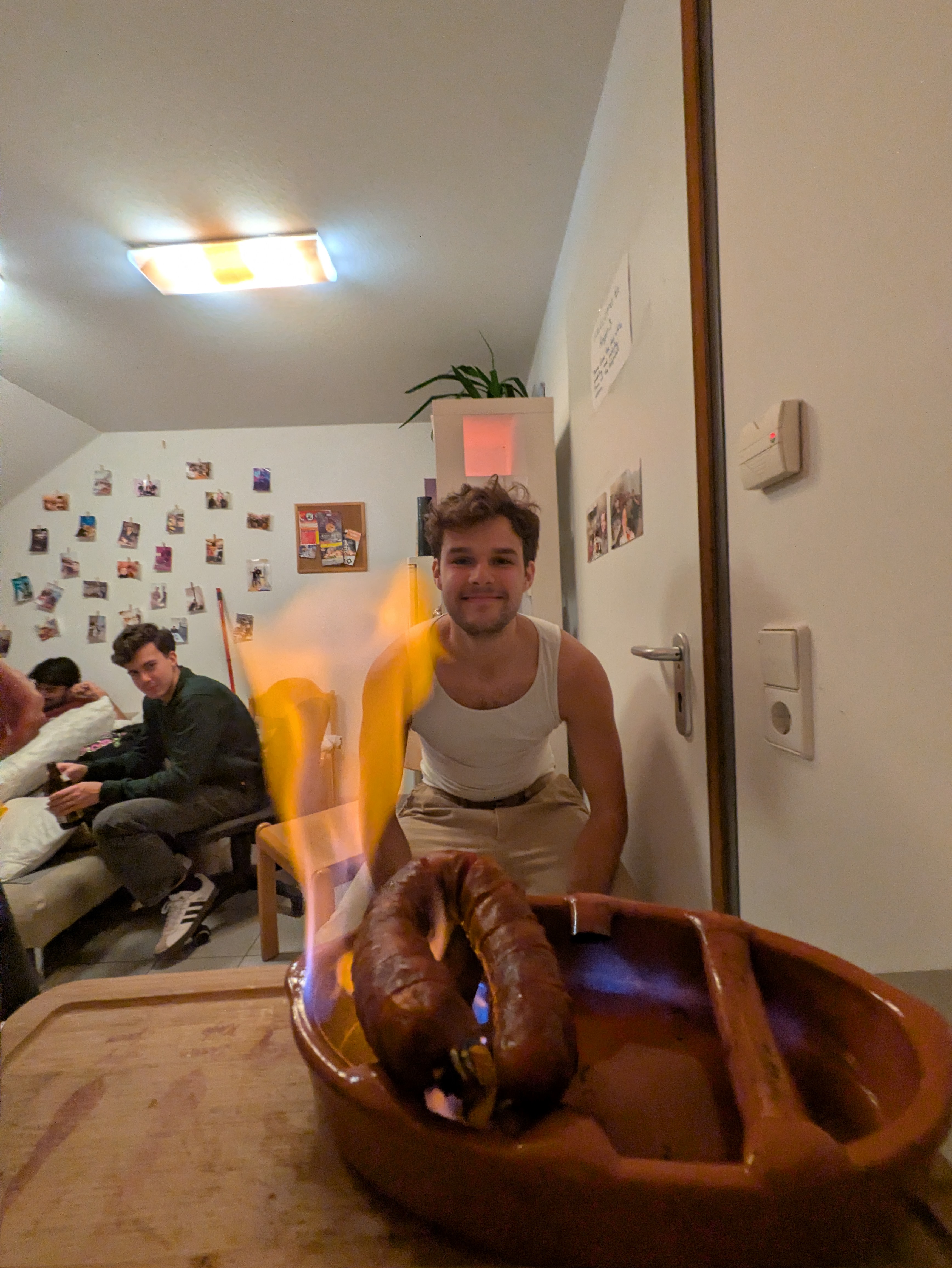 大学にはヨーロッパからだけではなく多国籍の留学生がおり、その中でも多くのメキシコ人留学生がいます。私も本学でスペイン語を学んでいたことから、少しスペイン語で交流することができました。9月16日のメキシコ独立記念日には、隣町のメキシコ料理レストランでポソレという伝統的なスープを味わいながらお祝いをしました。ドイツにいながらも、さまざまな国の人々と出会い、このように異なる文化を共有できることに、留学の大きな魅力を感じています。また、2023年後期に交換留学生として広島経済大学で学んでいたドイツ人学生とも会い、親交を深めました。