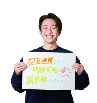 私の所属している「スポーツを通じた共生社会実現プロジェクト」では、性別や年齢、障がいの有無にかかわらず、さまざまな人々が分け隔てなく暮らしていける共生社会の実現を目指しています。この共生社会を実現するために、この科目で学んだ「意見が異なっても相手を受け入れ、相手の考えに寄り添いながらお互いが納得できる着地点を一緒に探す」ことを忘れずに、持続可能な共生社会を実現できるよう、様々な背景がある人達と良い関係性を築きながら活動して行きます。