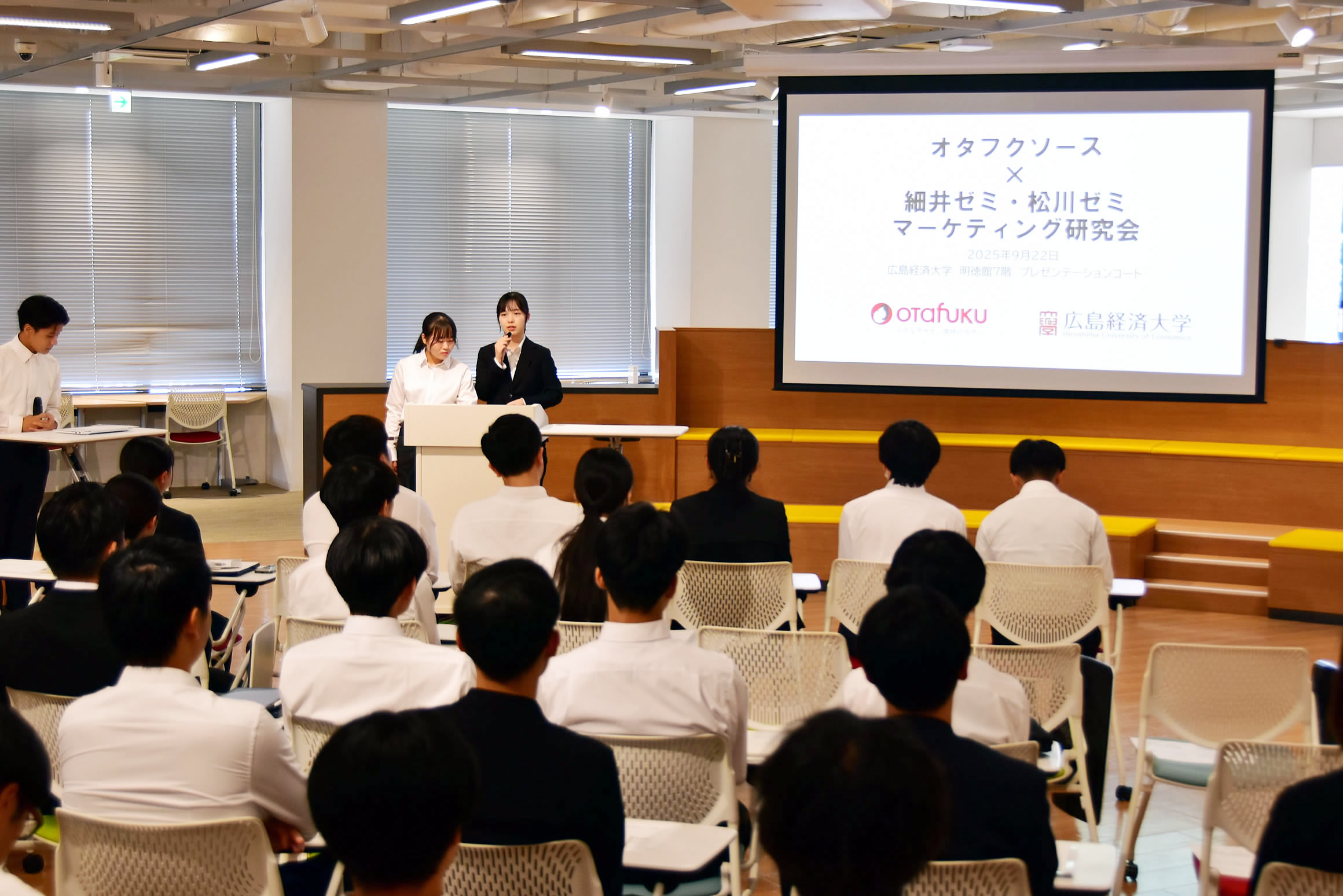 経営学部経営学科の細井謙一教授のゼミナール(2・3年次:プレゼミ、ゼミⅠ)の学生らが、ゼミ活動の一環として、毎年オタフクソース株式会社の協力を得て、オタフクソースへのマーケティング活動の改善提案に取り組んでいます。このマーケティング研究会は2024年度で8回目となります。