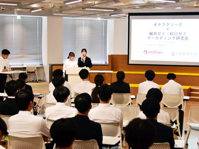 経営学部経営学科の細井謙一教授のゼミナール(2・3年次:プレゼミ、ゼミⅠ)は、ゼミ活動の一環として、オタフクソース株式会社の協力を得て、マーケティング活動の改善提案に取り組んでいます。2025年度は松川佳洋教授のゼミナール(3・4年次:ゼミⅠ・Ⅱ)の学生も参加し、より多角的な視点からの検討が行われました。このマーケティング研究会は今年度で9回目となります。