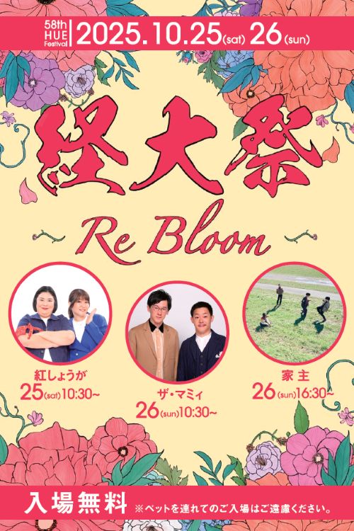また、今年度も2日間開催となります。過去の実行委員たちが掲げた「学生の、学生による、学生のための」という理念を継承しつつ、地域の皆さまをはじめとした幅広い世代の方々にも楽しんでいただくことで、「大学と地域をつなぐ架け橋となる経大祭」を目指しています。第58期大学祭実行委員が一丸となり、皆さまに楽しんでいただけるようさまざまな企画を用意しておりますので、是非お越しください。