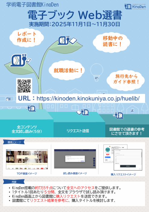 KinoDen(キノデン)は、紀伊國屋書店が提供する電子ブックサービスで、日本語を中心とした全分野の電子ブックが収録されています。今回のWeb選書では、約7万5000冊の「全文」を5分間試し読みした後、図書館で購入してもらいたい電子ブックを選書し、リクエストすることができます。