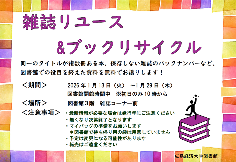ご希望の方は期間中に図書館3階雑誌コーナー前にお越しください。