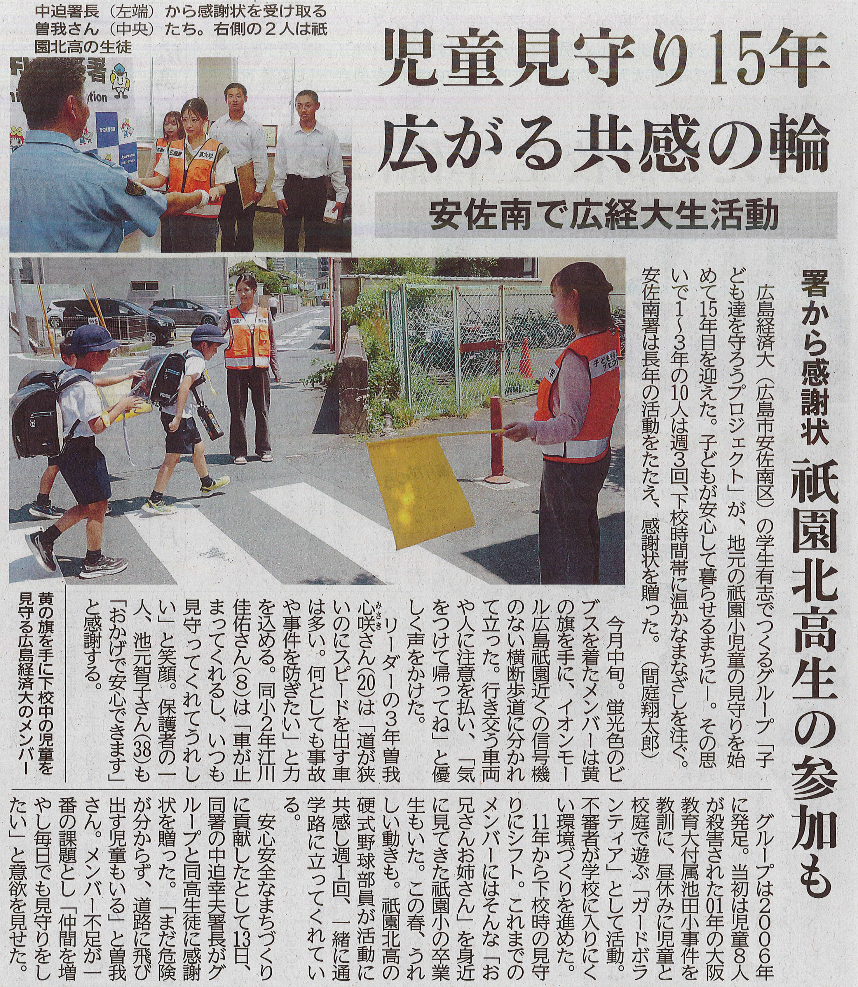 子ども達を守ろうプロジェクトが2011年から続けている「下校安全サポート」は、児童が事件や事故にあうことなく安全に下校できるように、人通りの少ない道や交通量が多い場所などに立って見守る活動で、今年度5月からは、広島県立祇園北高等学校硬式野球部にも呼びかけて、共同で実施しています。