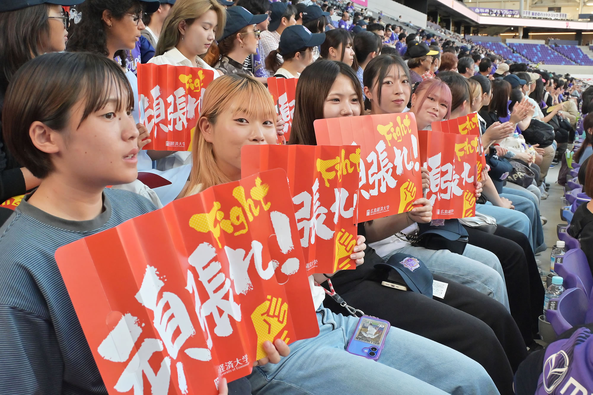当日は、女子学生だけでなく広島に来たばかりの留学生にも声をかけ、総勢51名の学生と教職員が参加。参加者全員でお揃いのキャップをかぶって応援しました。