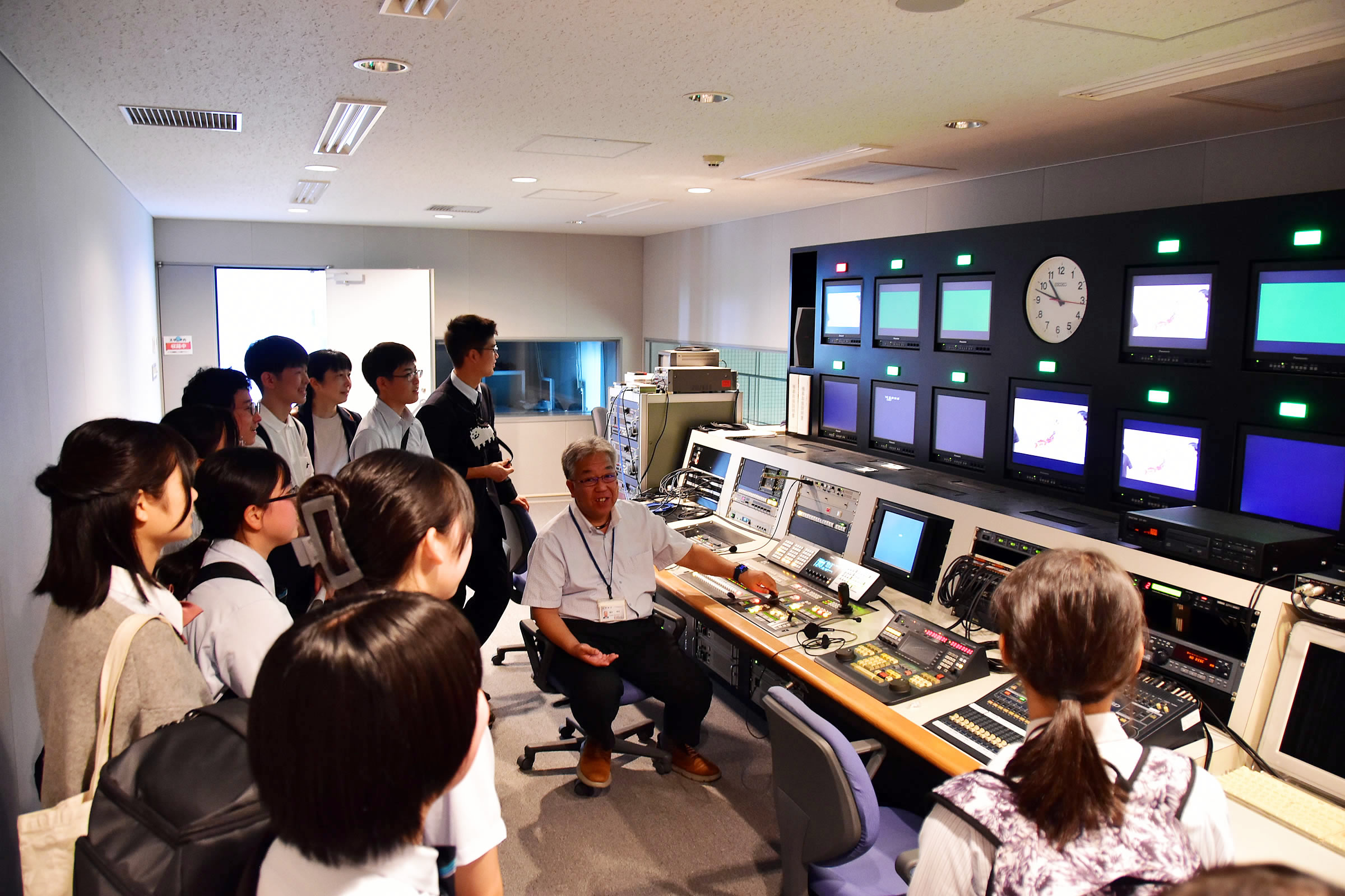 渡辺ゼミの学生たちは、高校生に対しアカデミックコモンズ「明徳館」やスタジオを備えた「メディア情報センター」、「図書館」などの教育施設を紹介しました。また、プロ選手やオリンピック選手を輩出した部が普段練習している「野球場」、「陸上競技場」、さらにはスラムダンクのモデルとなった「石田記念体育館」などのスポーツ施設も巡りました。