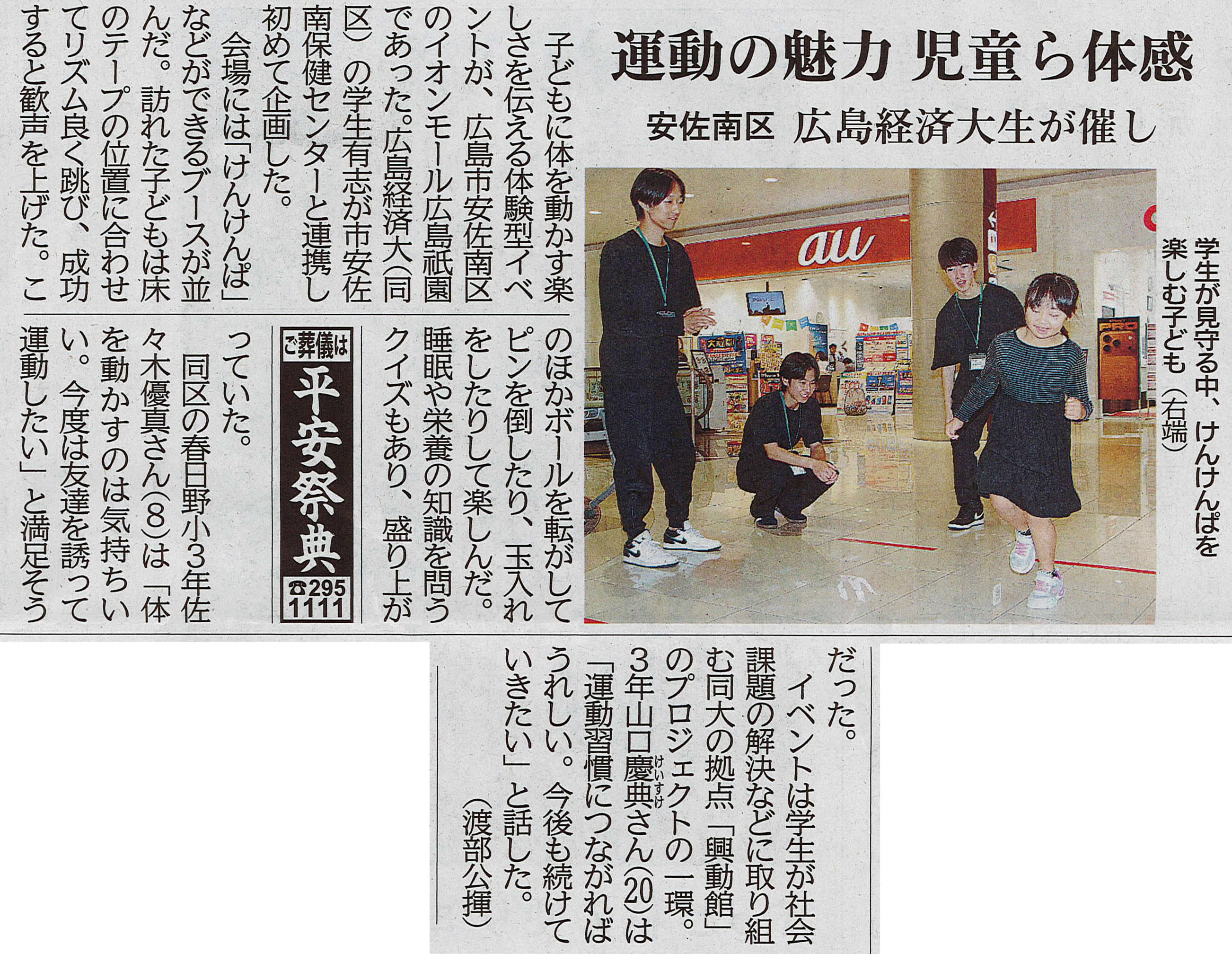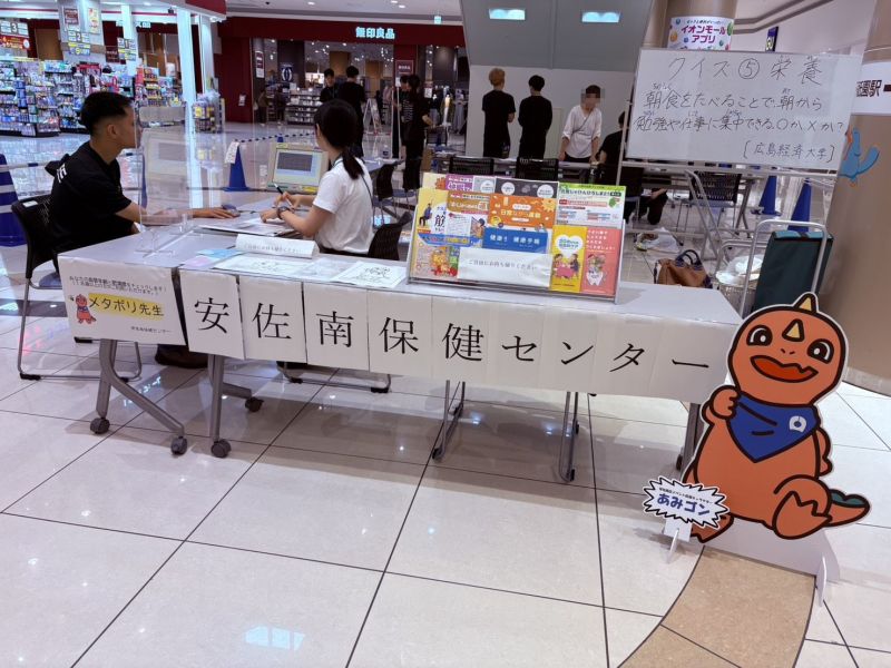 当日は、「ミニボーリング」「けんけんぱ」「玉入れ」の3つの運動体験ブースを設置し、子ども達は楽しみながら体を動かしていました。また、睡眠や栄養に関するクイズと広島市安佐南保健センターによる「血管年齢測定」を実施し、健康への関心を高めるきっかけとしました。