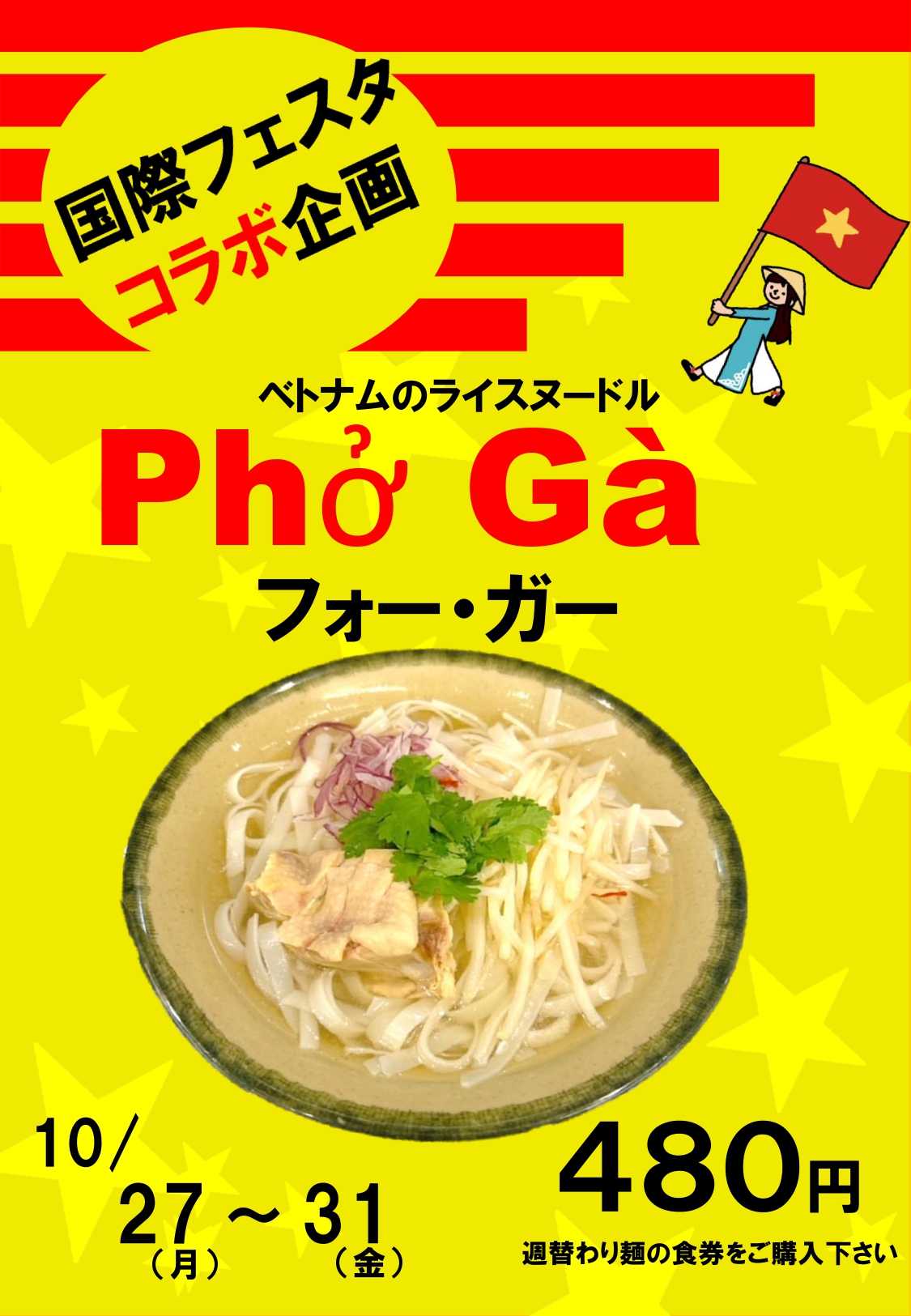 第1週(10月27日〜31日)は、ベトナムを代表する米粉の麺料理「フォー」を週替わり麺として提供しています。鶏肉をトッピングしたスープ麺は、あっさりとした味わいながらもコクがあり、多くの学生に好評です。