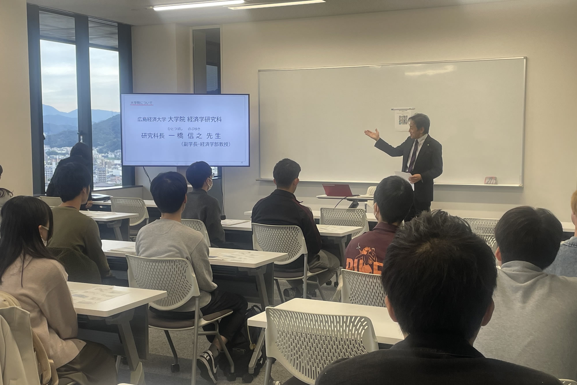 はじめに、大学院経済学研究科 一橋 信之研究科長より開会の挨拶があり、大学院の教育方針や学びの特徴について説明が行われました。