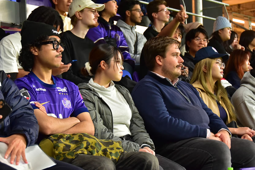 留学生や一年生などは、初スタジアム/初サッカー観戦という学生もいて、熱気ある応援やピッチ上での熱き戦いに圧倒されていました。試合展開は終始ヒヤヒヤの中、逆襲からの得点で一気に盛り上がり、会場のテンションはマックス。試合終盤での退場者もありましたが、逆にそれが奏功し会場が一体となり「1-0」での勝利を勝ち取りました。