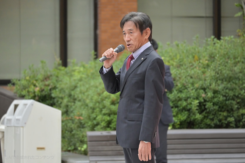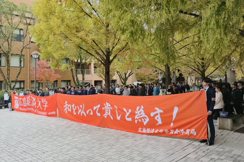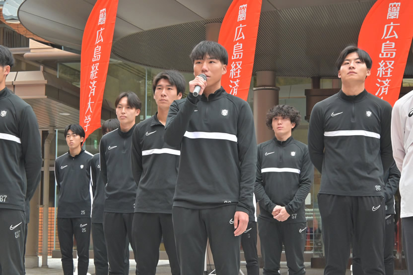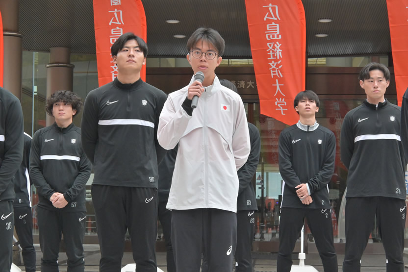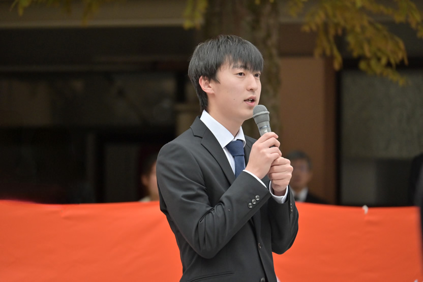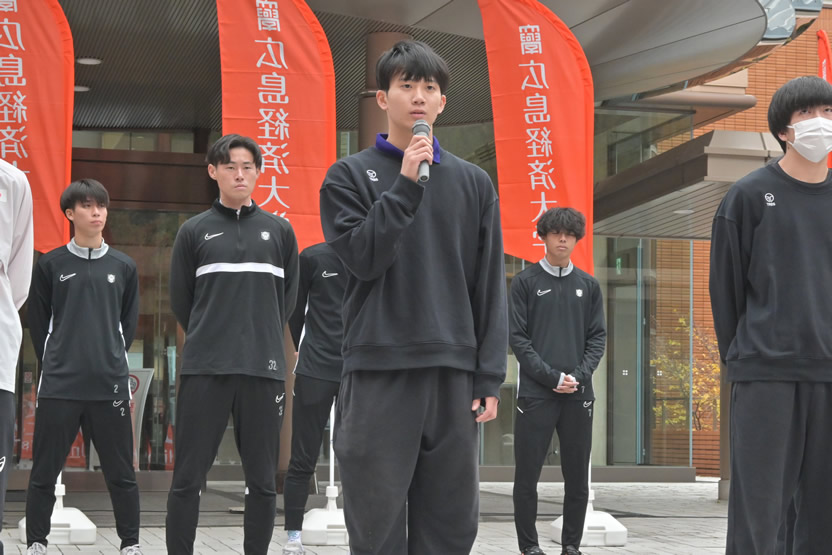 一橋信之副学長・加藤弘己体育局長から激励の言葉が贈られ、その後、出場団体の代表学生が大会への想いを語ってくれました。