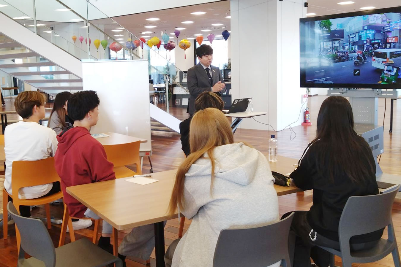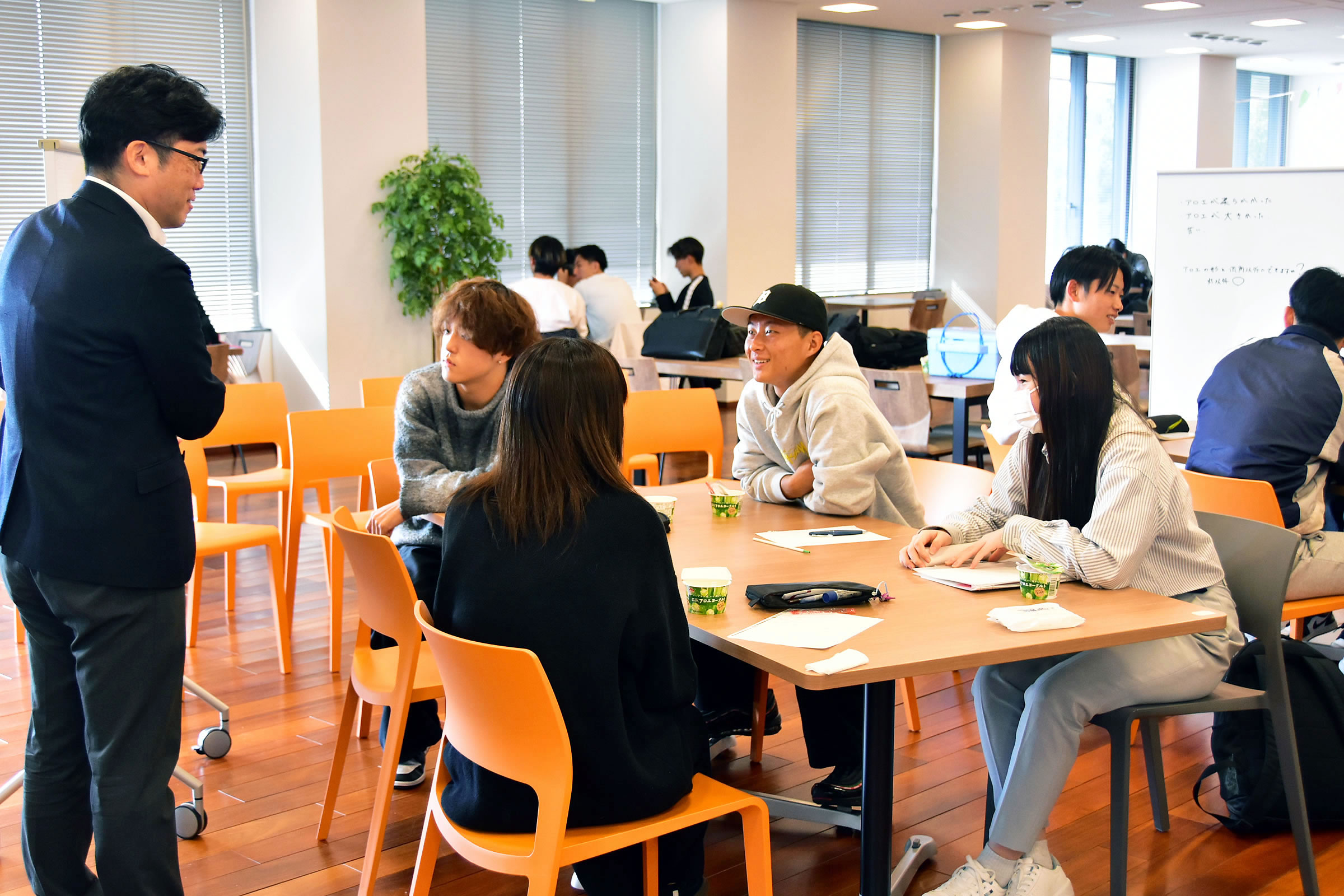 10月27日(月)、森永乳業から中四国支店カスタマー営業部長らが来学し、今回の産学連携の主旨や企業紹介、ヨーグルトを取り巻く環境やアロエヨーグルトに関するこれまでの取組みについて講義がありました。学生たちは、これから市場環境の分析やコンセプト開発などを行い、商品設計変更を伴わないリブランディングの提言と、広島での若年層顧客との接点づくりの提案という2つのミッションに対し、マーケティングプランを検討のうえ1月に同社に提案・発表する予定です。