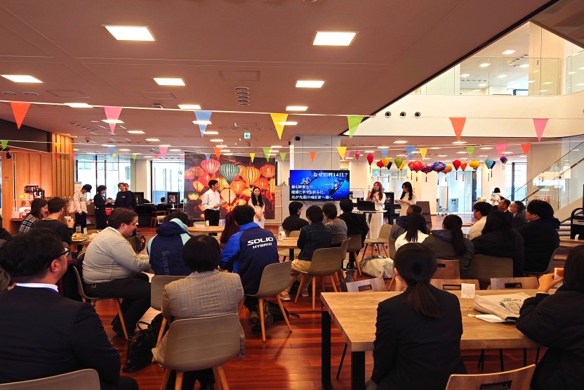 今回発表を担当したのは、ベトナム出身の留学生ガンさん、アインさん、チュオンさん、ホアさんの4名です。ガンさんは短期交換留学生で、アインさん、チュオンさん、ホアさんは経営学科の正規留学生です。ガンさんが英語で発表を行い、その内容を3人が日本語で通訳しました。