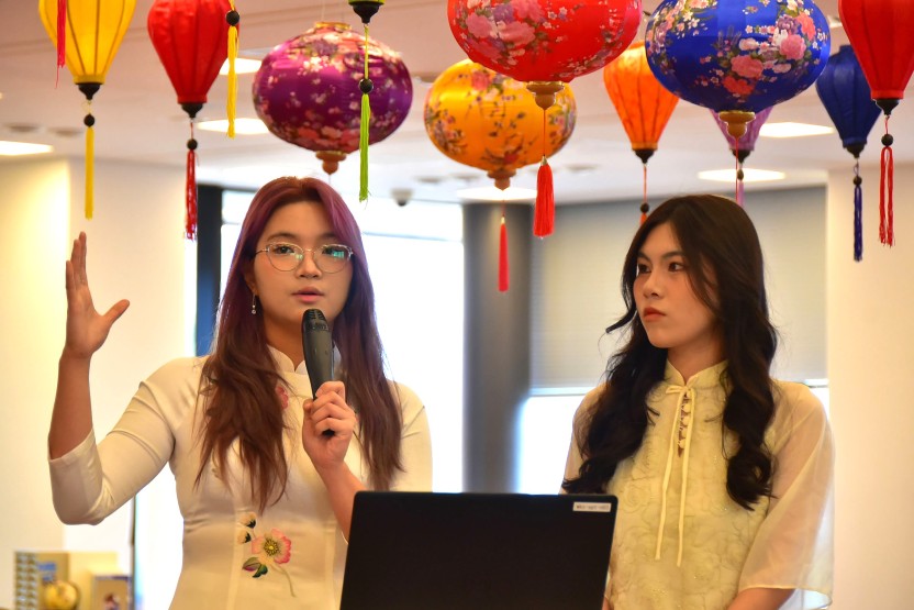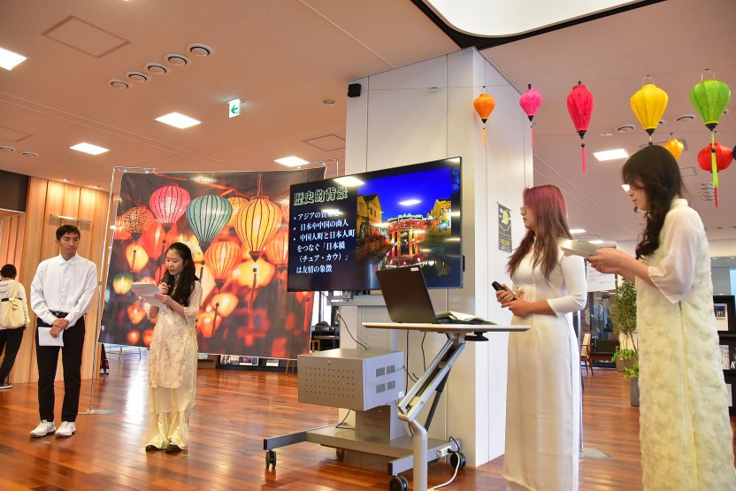 テーマは、ベトナム中部の古都ホイアンで毎月満月の夜に行われる「ランタンまつり」です。発表では、満月の日に家族や先祖に感謝する風習、国を超えた交流の象徴「日本橋(チュア・カウ)」、そしてガンさんが子どもの頃に見たランタンの思い出が写真とともに紹介されました。「ランタンは希望・平和・幸運の象徴であり、ランタンの灯は、たとえ世界が暗く沈んでも、私たちの心を明るく照らす」という言葉が印象的で、学生たちも熱心に耳を傾けていました。