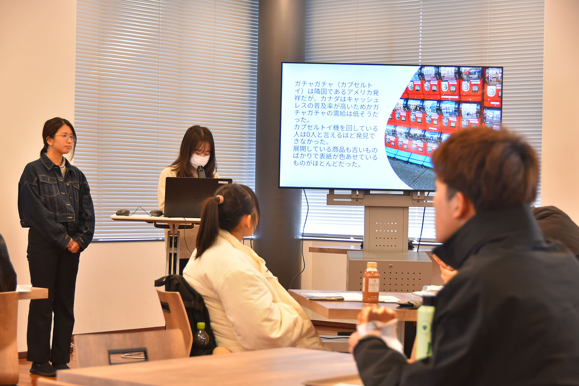 カナダ短期語学留学の発表では、約3週間の滞在を通して得た環境意識、食文化、就職事情など、授業やフィールドワークから読み取った社会の特徴や価値観の違いについて、現地社会を分析的に捉えた内容が紹介されました。一方、シンガポール体験留学の発表では、9名のうち8名が初めての海外ということで10日間の短期体験で得た生活感あふれる発見が中心でした。多言語社会ならではの空気感、現地学生のファッションやアルバイト事情、F1グランプリの盛り上がりなど、映像や音源を交えながらリアルな体験が語られ、臨場感ある内容となりました。
