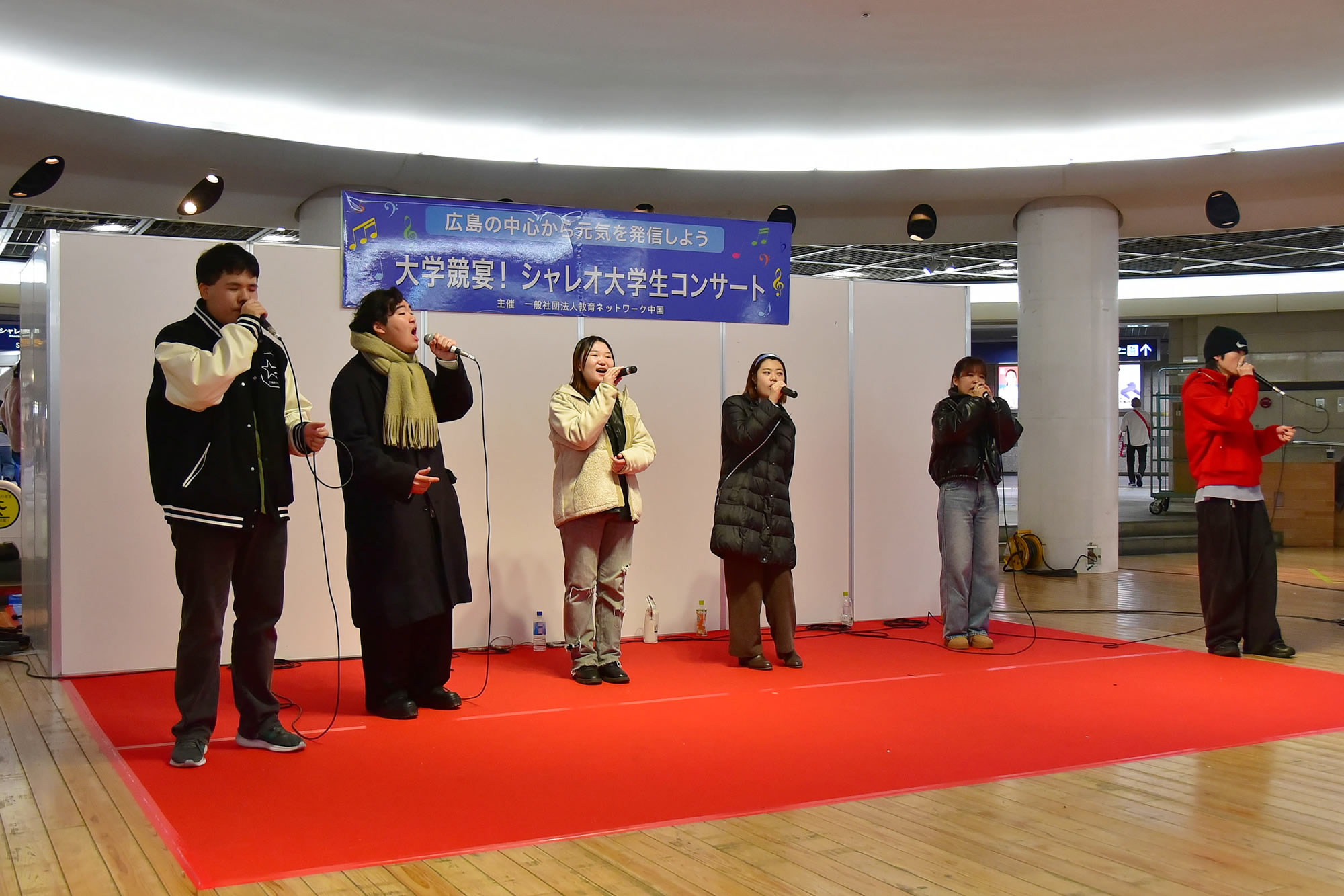 12月7日(日)、教育ネットワーク中国主催の「大学競宴!シャレオ大学生コンサート~なかちゃん音楽の輪~」がシャレオ中央広場で開催され、本学からはアカペラサークルBBQが参加しました。