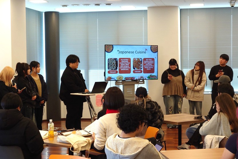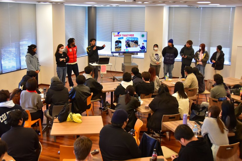 この発表会は、短期交換留学生が国ごとにチームを組み、その国に関心を持つ日本人学生(ランゲージ・パートナー)と、約3か月間にわたって行ってきた国際交流の成果を共有する場として実施されました。発表では、各チームが交流の中で学んだことや感じたことを振り返りながら、それぞれの取り組みを発表しました。