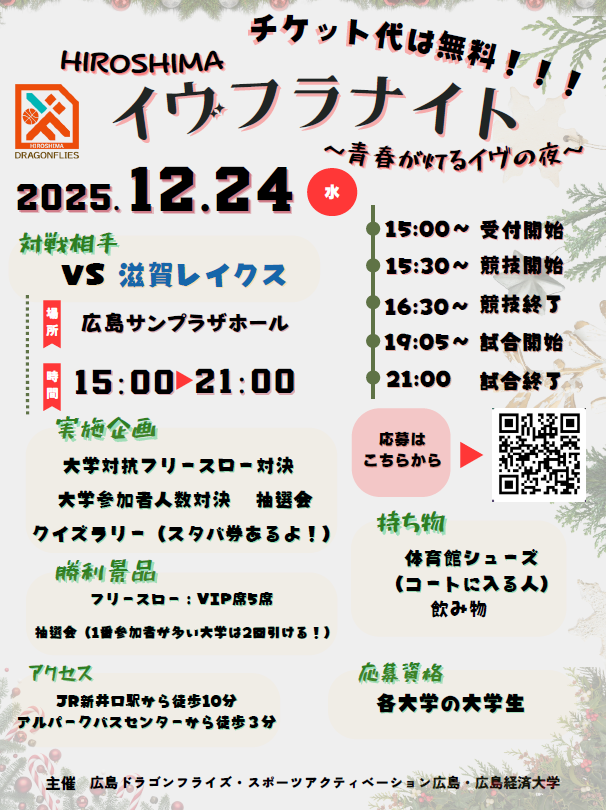 林和夫ゼミ(スポーツ経営学科)が、12月24日(水)に開催される「広島ドラゴンフライズvs滋賀レイクス」の試合において、大学生を中心とした若者世代を集客するイベントに取り組んでいます。