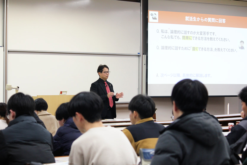 今回は「面接試験」をテーマに、全国の大学で講演を行う、就活コンサルタント 坂本 直文氏を特別講師としてお招きしました。講師からは、内定が獲得できる・高評価を得られる面接突破ポイント、さらに録画面接、WEB面接の注意点とコツ、さらに最新の生成AIツール対策も紹介。出席した学生は真剣な表情で、講師の言葉を聞き漏らさないようにしっかりメモを取っていました。