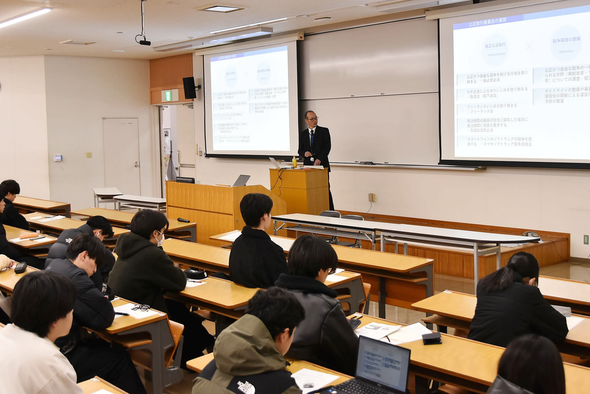 本授業では、産業組織と操業する企業の行動を分析しており、今回は「独占禁止法・下請法※・景品表示法」に関わる競争政策の現実について、学生が興味を持てる事例を中心に解説していただきました。学生にとって、専門家から最新情報を交えたお話を聞くことができ、これまでの学びを深める貴重な機会となりました。