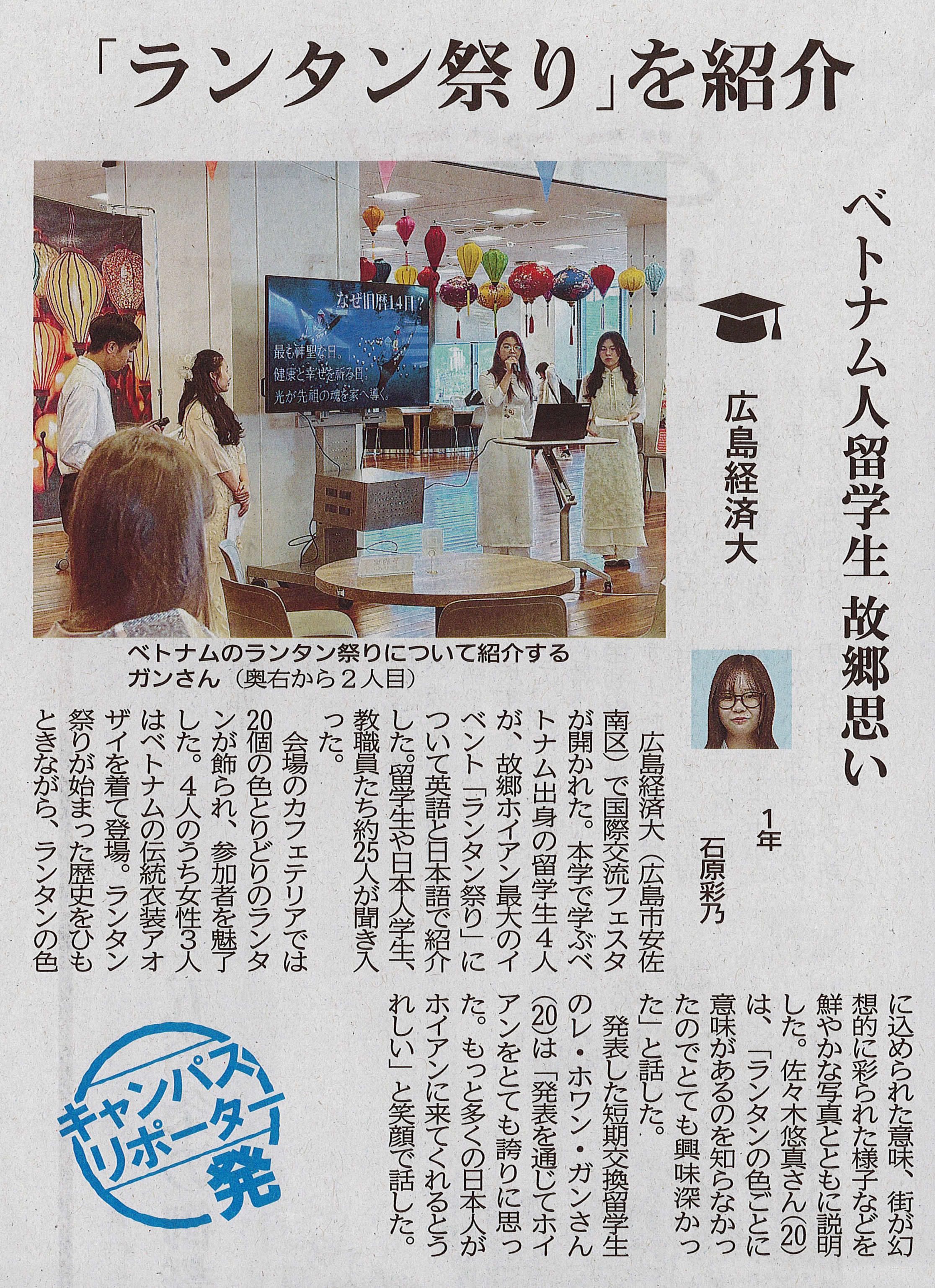 本学で国際交流フェスタを行いました。ベトナム出身の留学生4人が、故郷ホイアン最大のイベント「ランタン祭り」について英語と日本語で紹介しました。留学生や日本人学生、教職員たち約25人が聞き入りました。