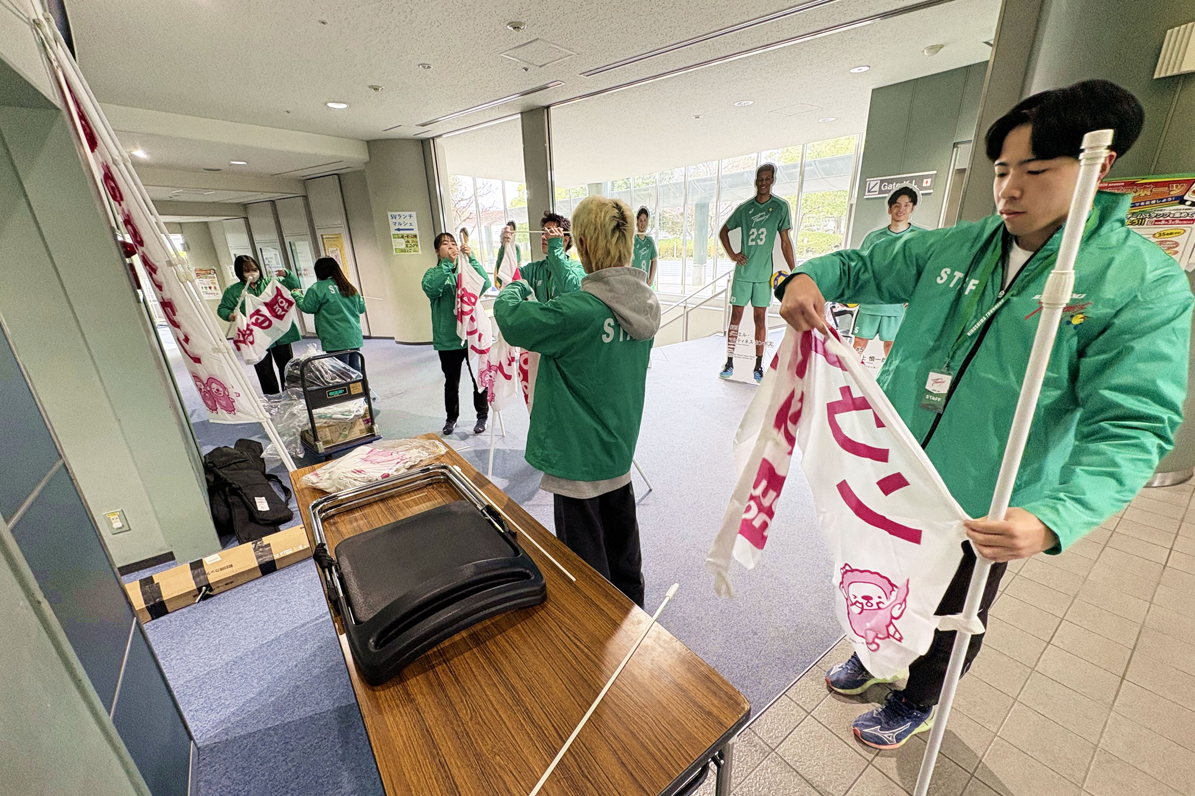 研修で体験した業務内容は、選手やスポンサーの幟の組み立てや設置、入場整理、招待入場者への受付対応、試合後セレモニーのサポート、終了後の会場撤収支援など多岐にわたりました。