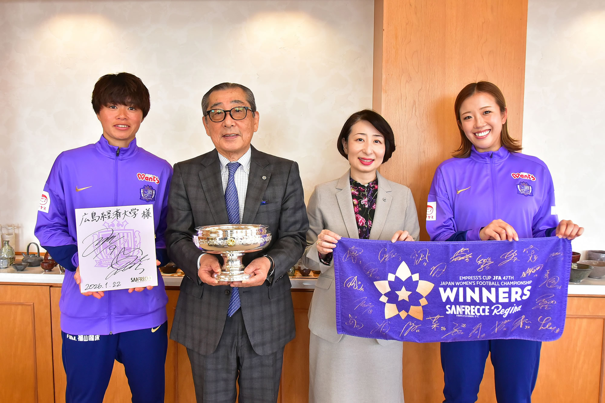 1月22日(木)、サンフレッチェ広島レジーナの市瀬千里選手と上野真美選手が本学を表敬訪問され、石田恒夫理事長と石田優子学長と懇談しました。
