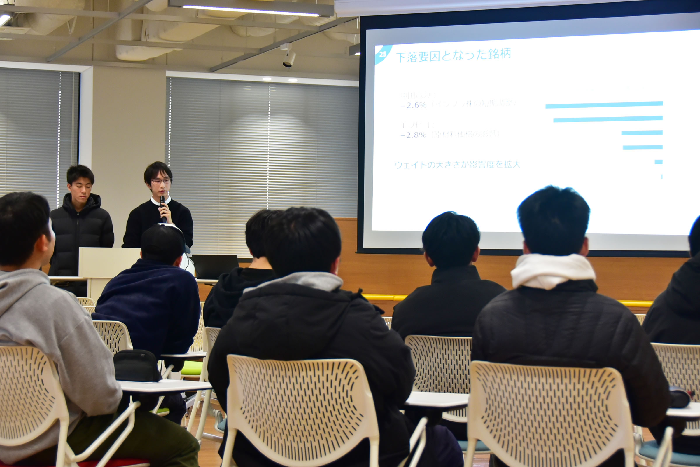 1月8日(木)、計量ファイナンスを学ぶ得津 康義ゼミ(経済学科)が、投資による社会課題の解決をテーマに、分析・考察したプランを提案する報告会を実施。経済学科から他に2ゼミが参加し聴講しました。