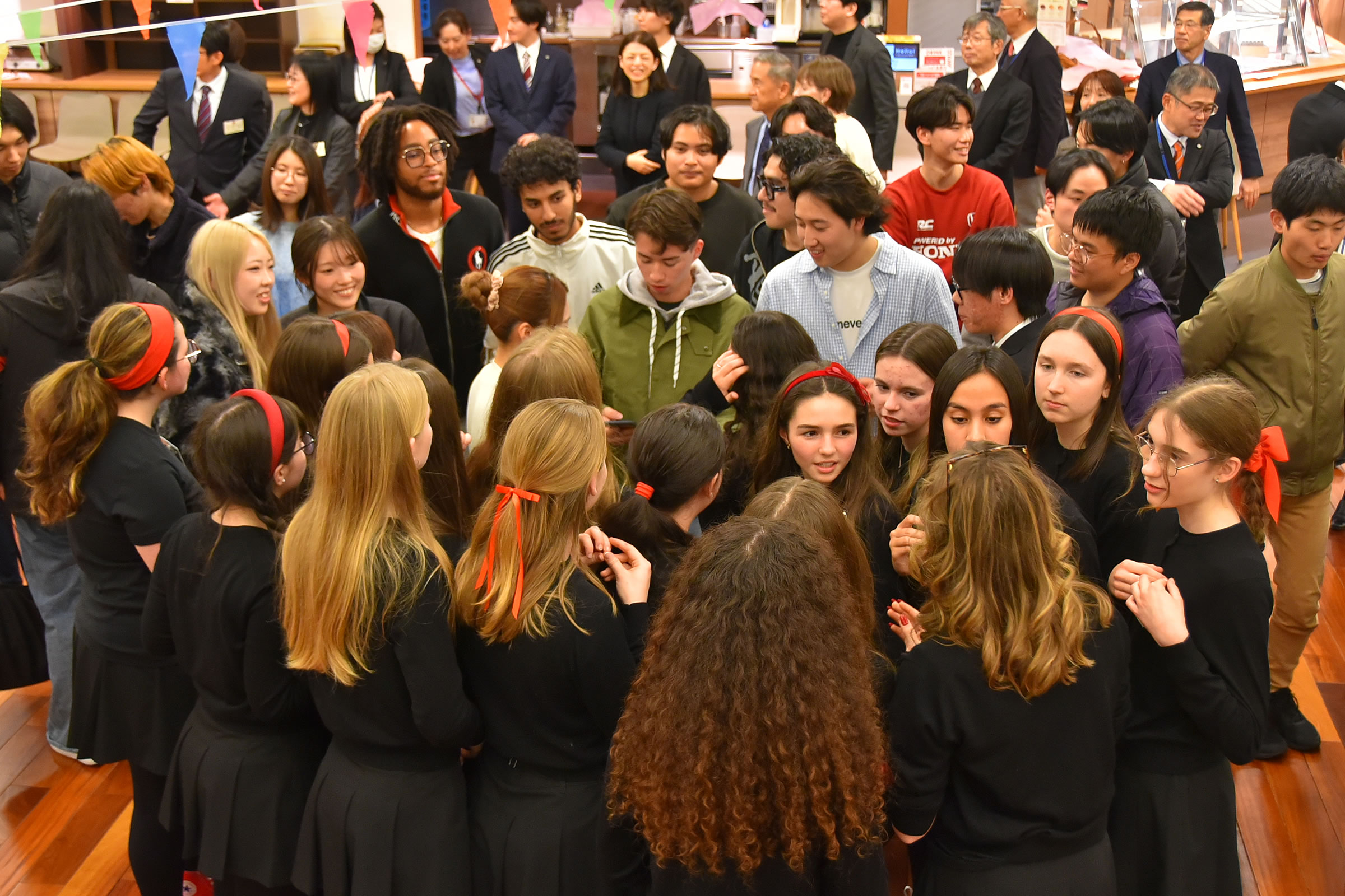 公演後には歓迎交流会が開かれ、本学学生によるミニイベントや交流も行われ、参加者同士が言葉を交わしながら親睦を深めました。歓迎会の最中には、カナダ少女合唱団と本学学生の交流の輪から歌声が上がるなど、文化や言語の違いを超えて音楽が人々の心をつなぐ素晴らしい夜となりました。
