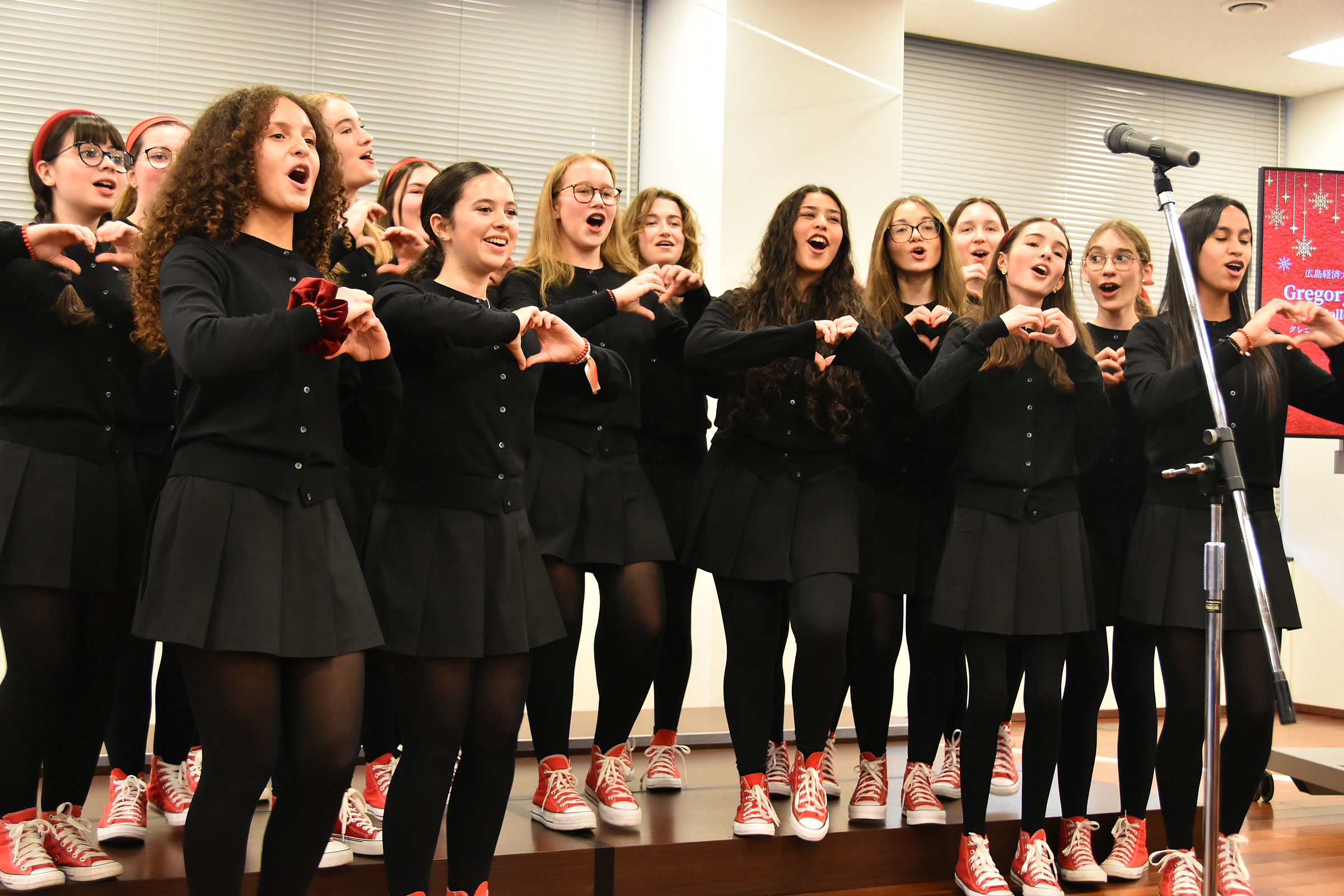来広1日目となる1月19日(月)では、名誉領事表敬訪問のほか、茶道部による茶道お点前体験、濱田敏彦教授による厳島に関する講義、グレゴリー氏及びカナダ少女合唱団による特別公演パフォーマンス、歓迎交流会と、広島の歴史・文化・平和を学ぶ多彩なプログラムが行われました。