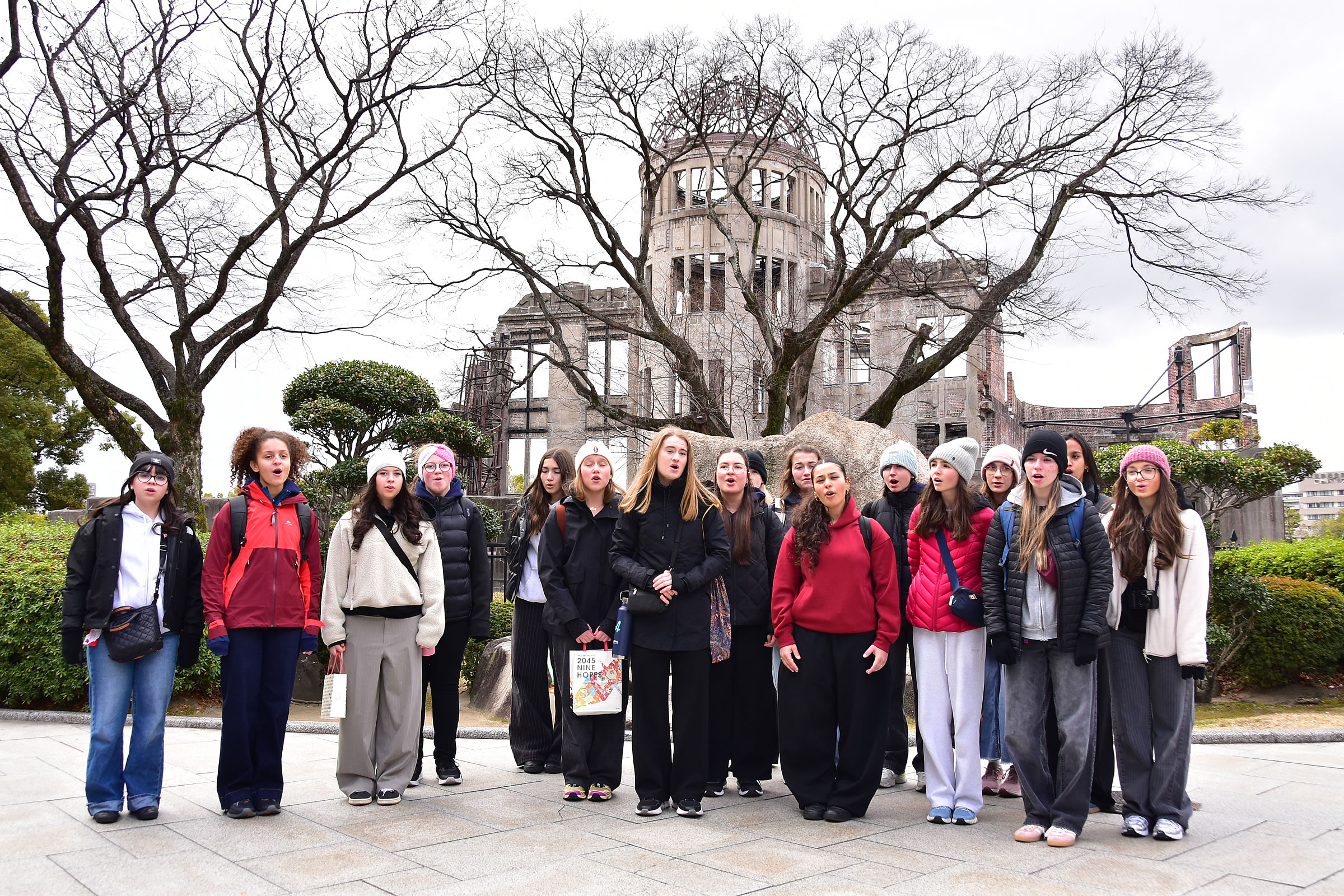 彼女たちは、原爆ドームの前でも平和の歌を捧げました。