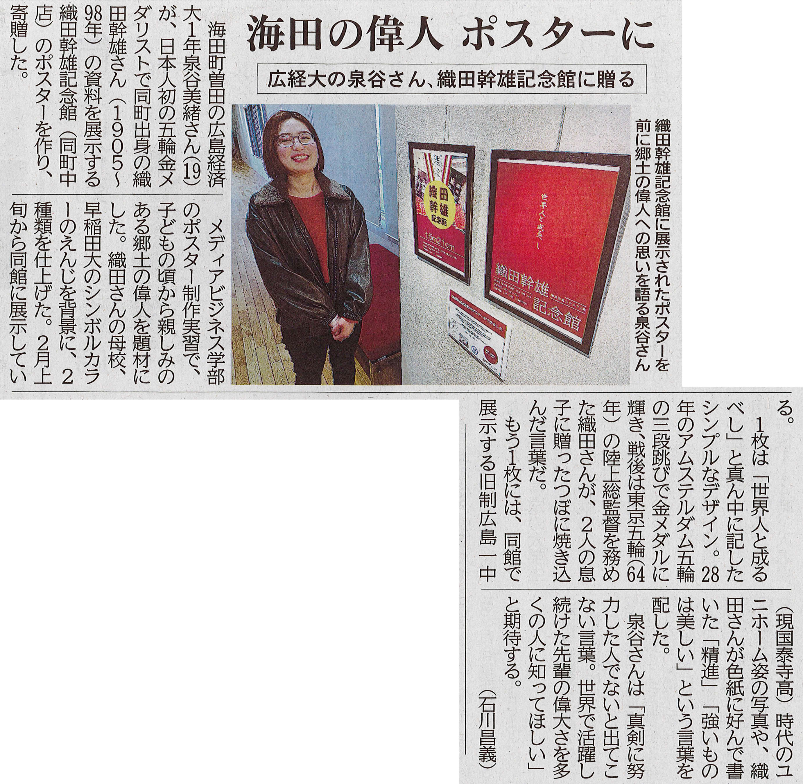 2月4日(水)、メディアビジネス学科1年の泉谷美緒さんが制作したポスターの展示が、海田町出身で日本人初のオリンピック金メダリストである「織田幹雄記念館」で開始されました。