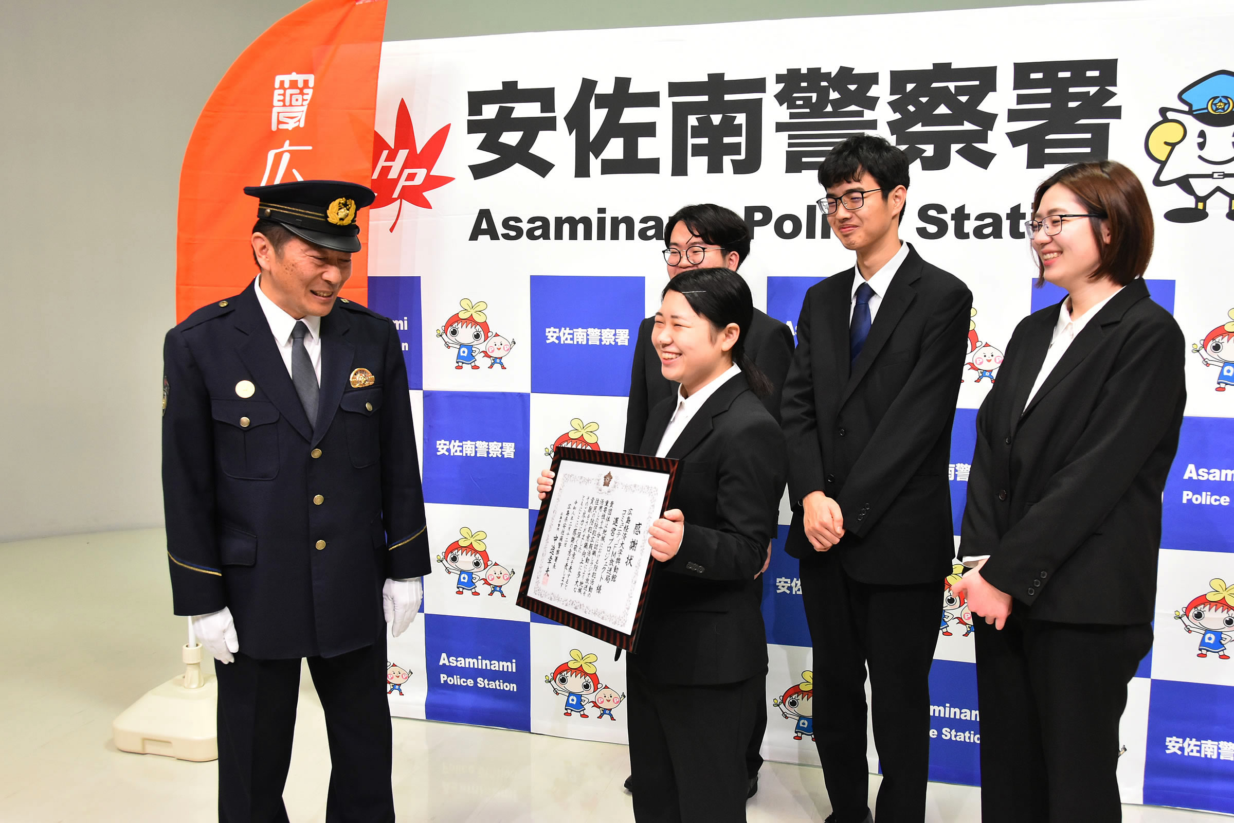 2/12(木)、本学メディア情報センターにおいて、コミュニティFM放送局運営プロジェクトの学生が、安佐南警察署より感謝状を受け取りました。