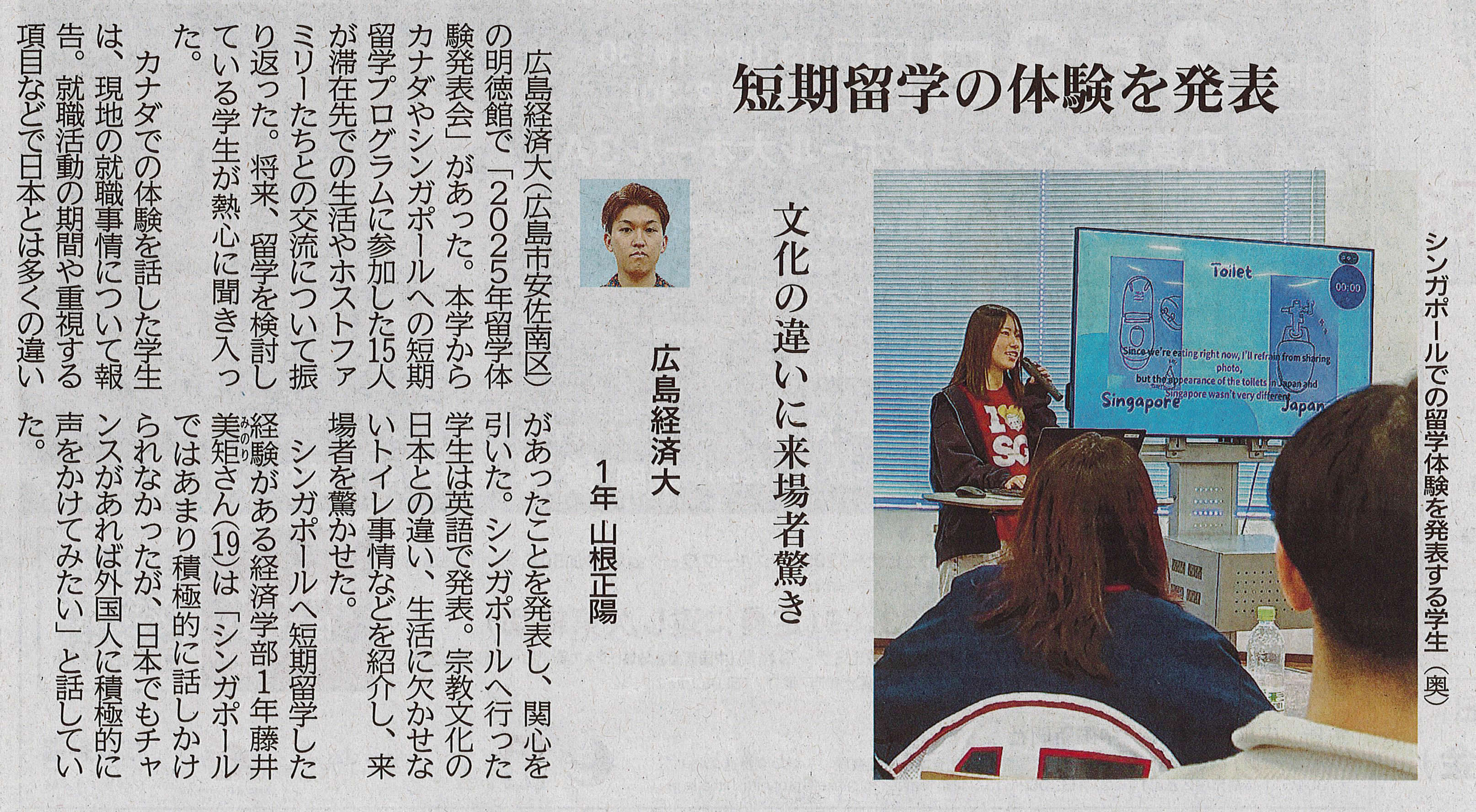 2月15日(日)、本学キャンパスリポーター山根正陽さん(メディアビジネス学部メディアビジネス学科1年)の記事が、中国新聞(9面)に掲載されました。