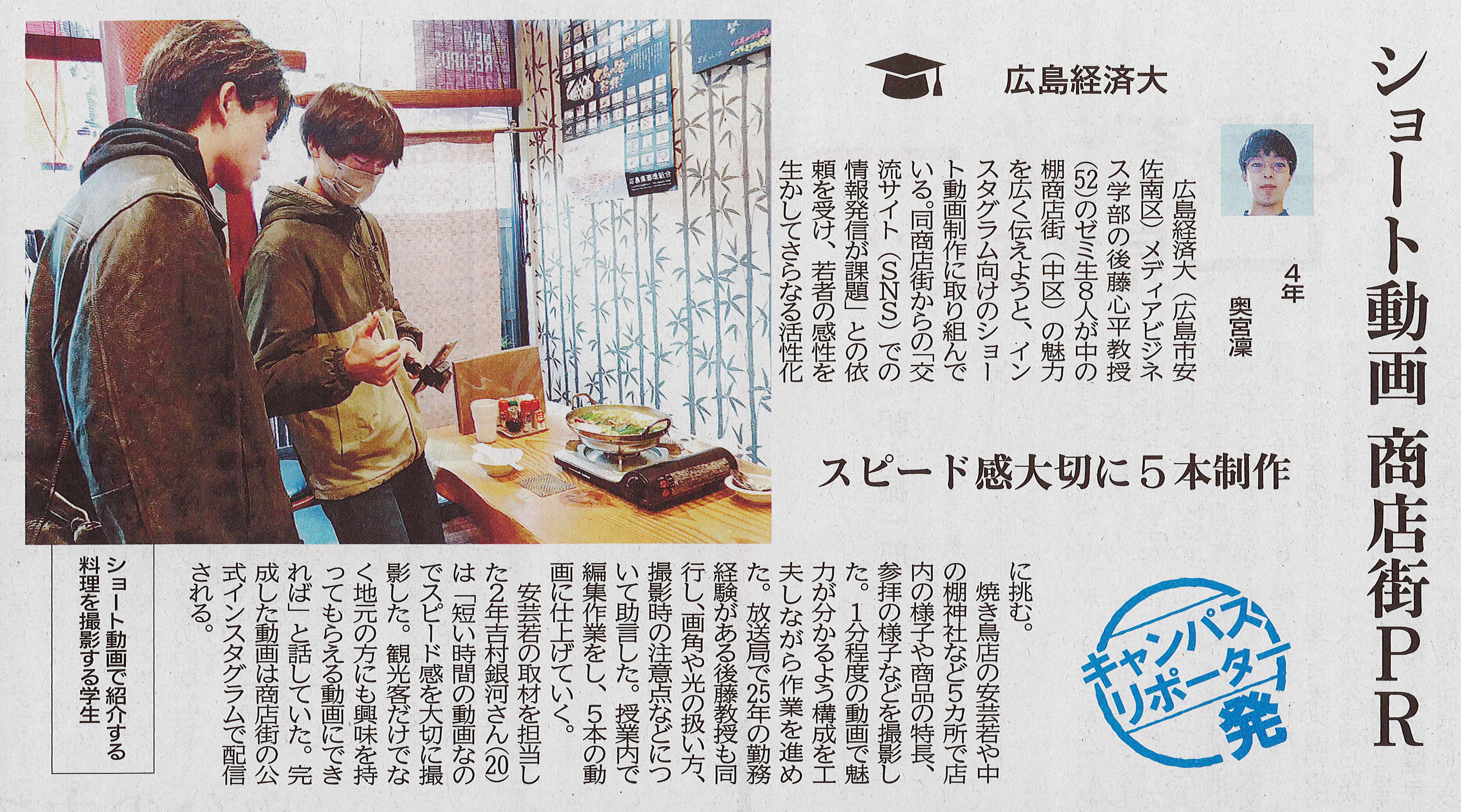 2月19日(木)、本学キャンパスリポーター奥宮凜さん(メディアビジネス学部メディアビジネス学科4年)の記事が、中国新聞SELECT(10面)に掲載されました。