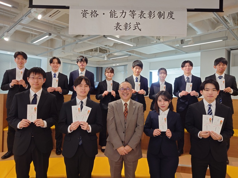 広島経済大学では資格取得によって将来の可能性を広げたいという学生を支援するため、「資格・能力等表彰制度」を設け、大学指定の資格を取得した学生に対し年2回表彰式を開催しています。