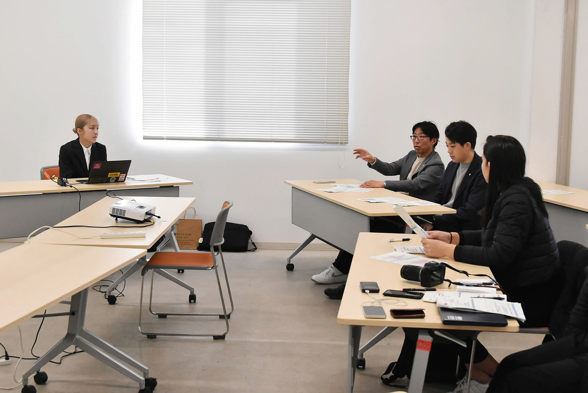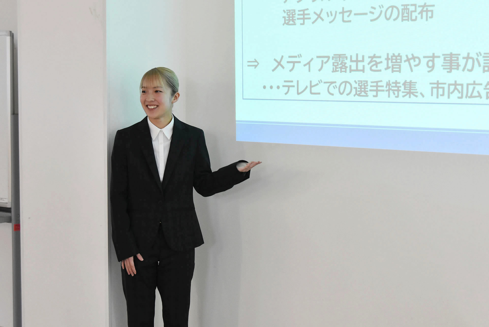 発表した岡本陽向さん(スポーツ経営学科4年)は、「ファンや選手へのアンケート調査、データ収集と分析など、大学で学んだ知識やスキルを活かしながら研究を進める中で、多くの気づきを得ることができました。研究成果を実際にクラブへ提案する機会をいただき、大変貴重な経験となりました。この提案がレジーナのさらなる発展に少しでもつながれば嬉しいです」と振り返りました。