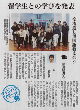 本学で「STEP留学生とランゲージパートナーによる交流発表会」を3日間行いました。ベルギー、ベトナム、デンマークなど10カ国の留学生24人と、ランゲージパートナーとして母国語を教え合う日本人学生30人が参加し、約3カ月間の学びの成果を発表しました。