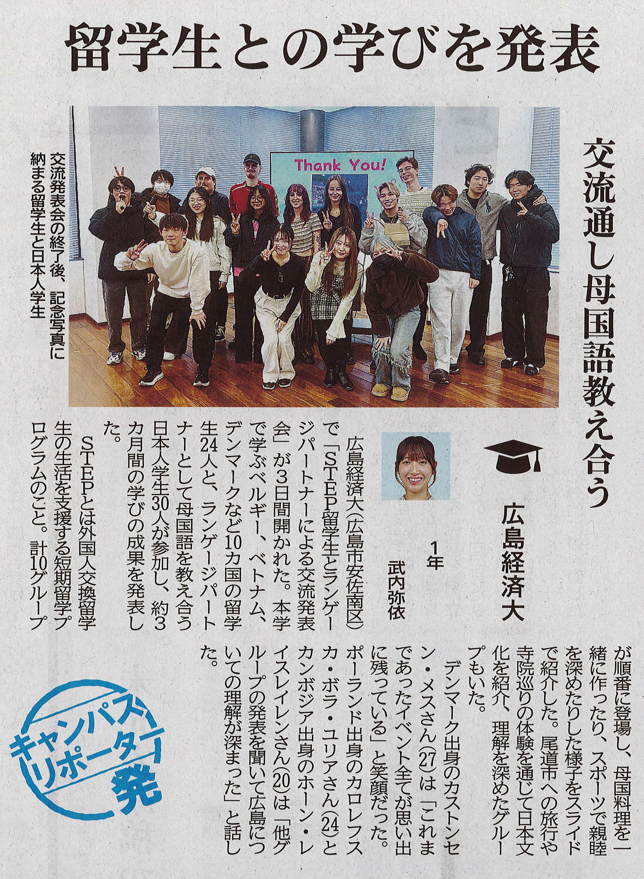3月26日(木)、本学キャンパスリポーター武内弥依さん(メディアビジネス学部メディアビジネス学科1年)の記事が、中国新聞SELECT(10面)に掲載されました。