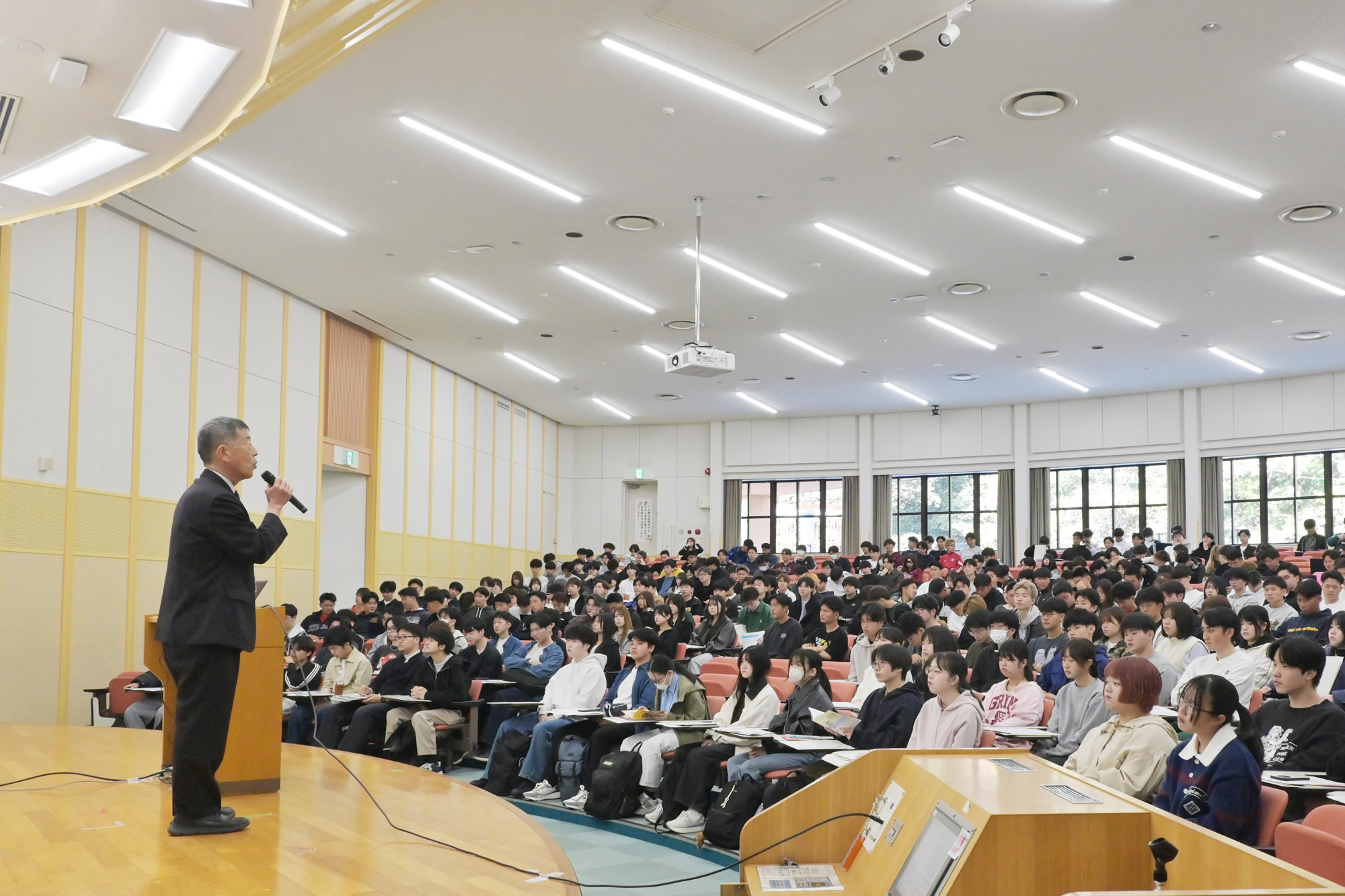 オリエンテーションでは、深川学務センター長による開会の挨拶に続き、大学生活において特に注意すべき点や、活用してほしい学内施設についての説明が行われました。
