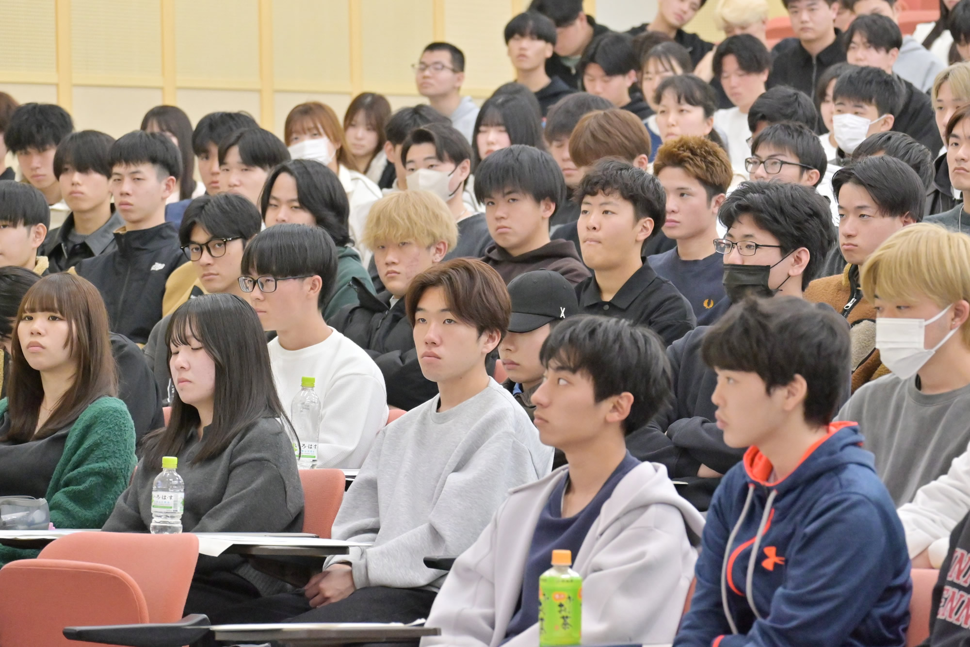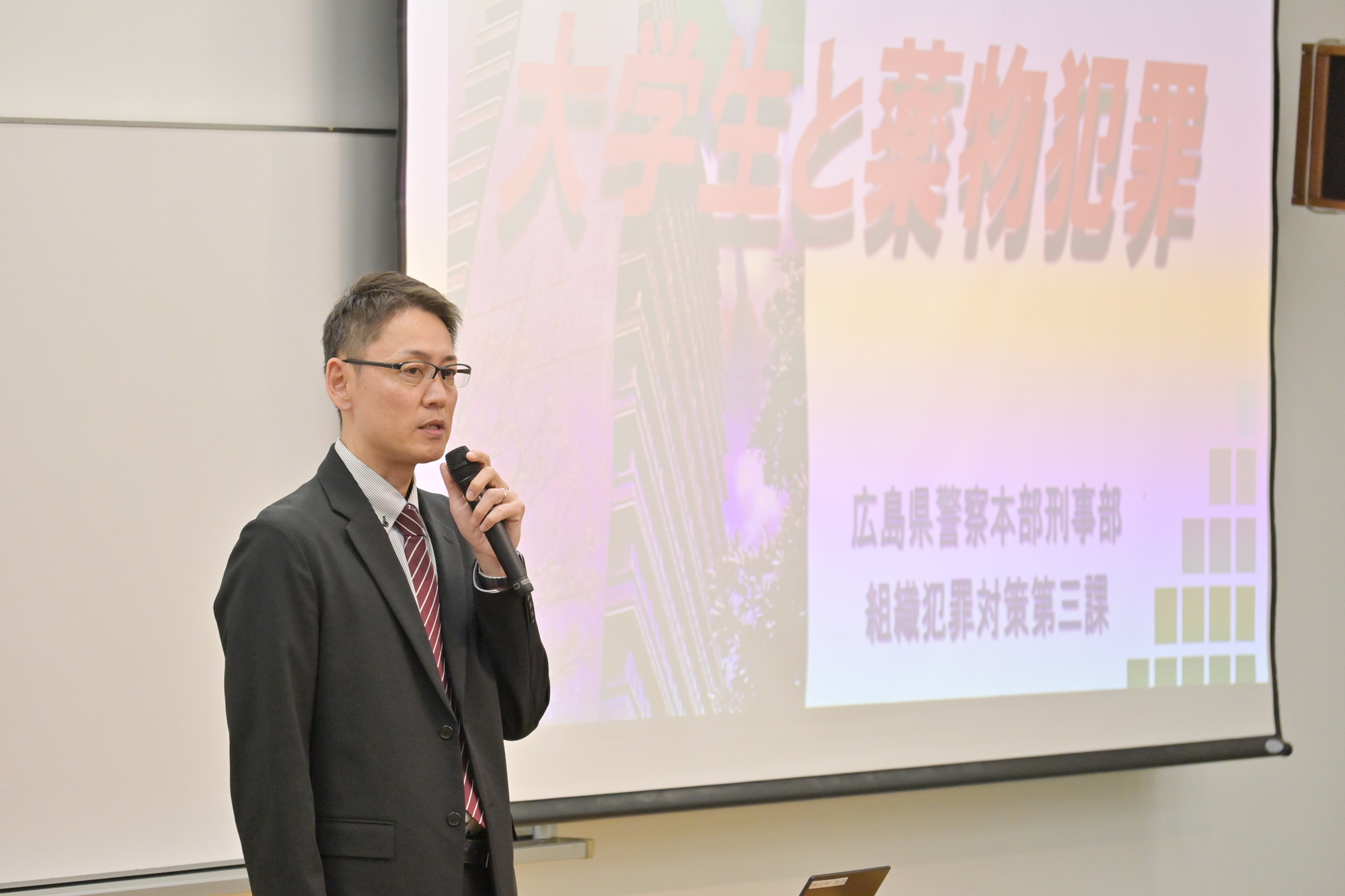 また、広島県警察本部刑事部組織犯罪対策第三課の神田弘一郎警部をお招きし、「大学生と薬物犯罪」と題したご講演をいただきました 。話題となっている薬物(大麻リキッド等)の危険性についてお話をいただき、学生たちは真剣な表情で耳を傾けていました。