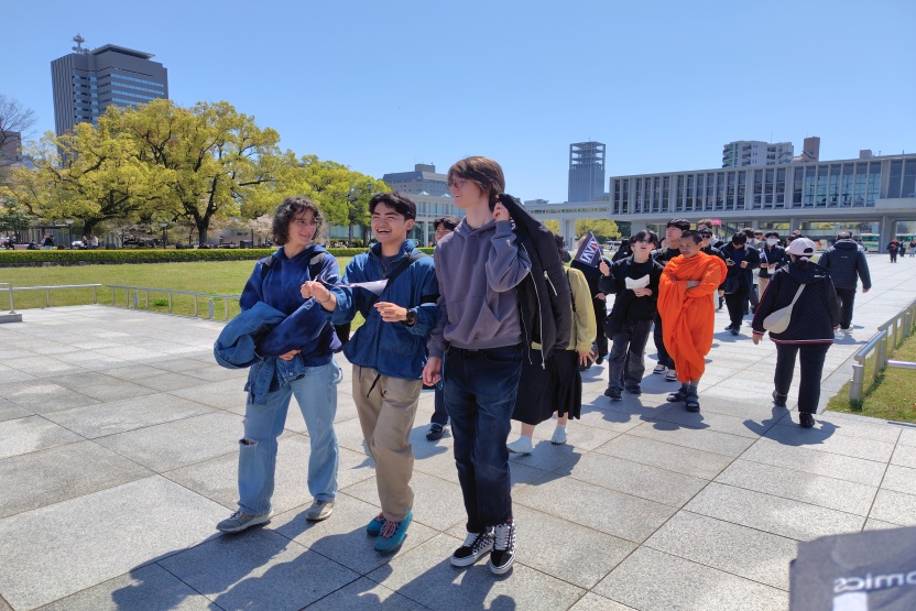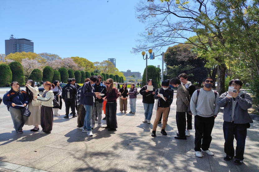 その後、平和記念資料館を見学し、平和記念公園内を小グループに分かれて巡り、学生自身がガイド役となって各所の説明を行いました。慰霊碑やモニュメントの前では、それぞれが事前に学んだ知識をもとに説明し、互いに理解を深める姿が見られました。参加者同士で意見交換を行うことで、より主体的な学びの場となりました。