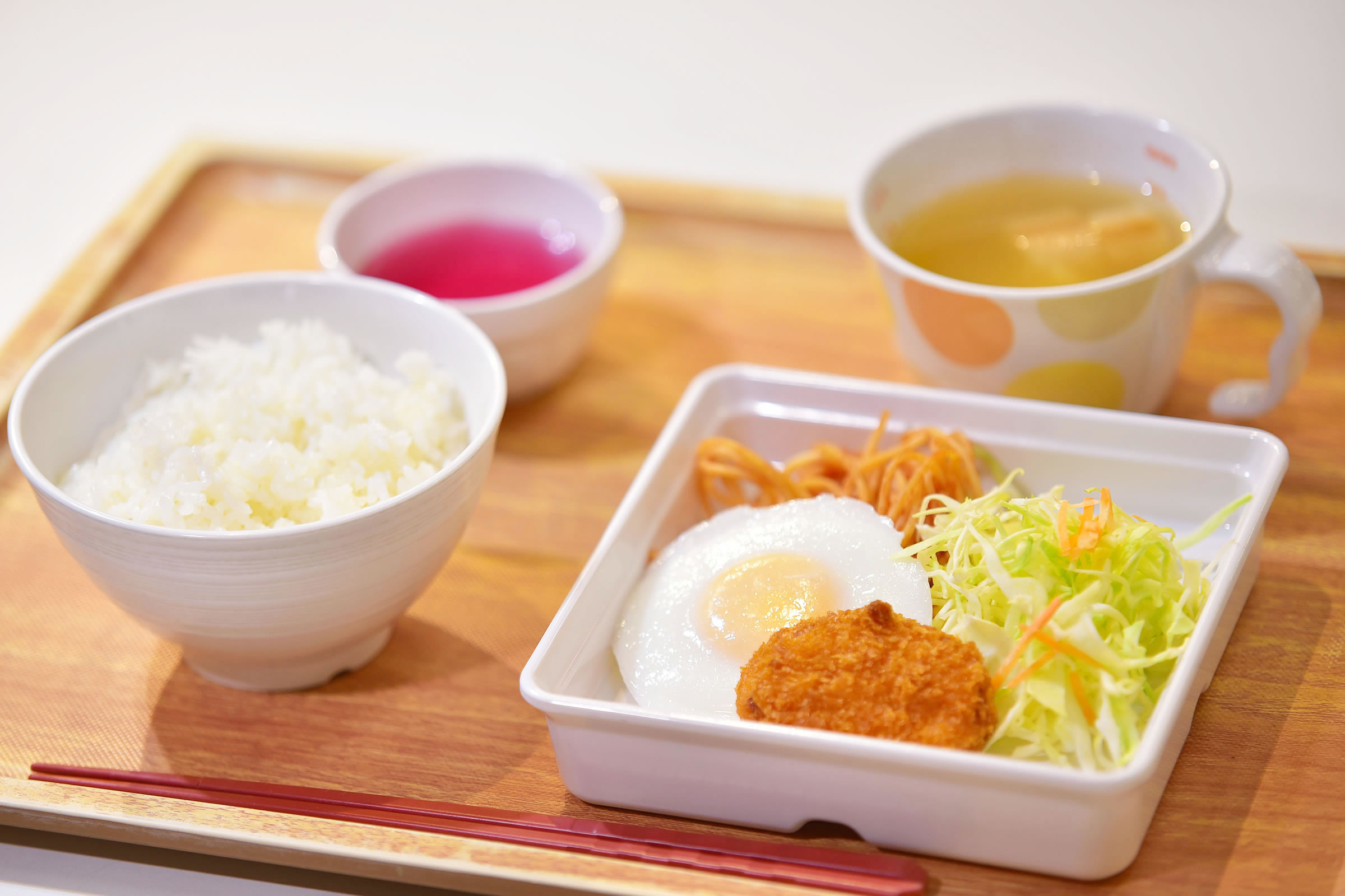 本学では、学生の健康と生活リズムを守り、安心して学業に専念できる環境づくりの一環として、学食で提供する食事の価格を抑えるための支援を行っています。なかでも、学生が抜きがちな朝食を授業期間中に毎日100円で提供する「100円朝食」は、保護者会等の支援を受けて2014年から継続している取り組みです。朝食をとる習慣が身につき、学習効果の向上にもつながると、学生から好評を得ています。