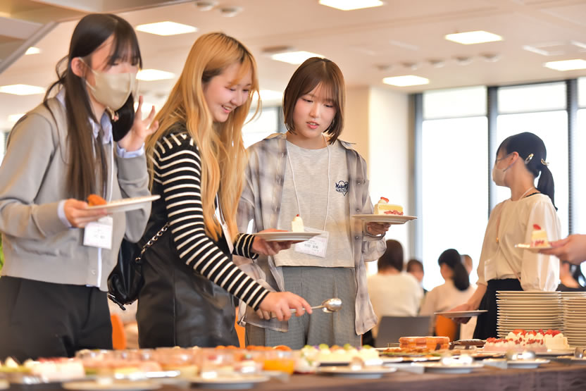 今年もANAクラウンプラザホテル広島によるケーキバイキングを提供し、「先輩学生との懇親会」と「こまち会スタッフによるプレゼンテーション」の2部構成で実施しました。
