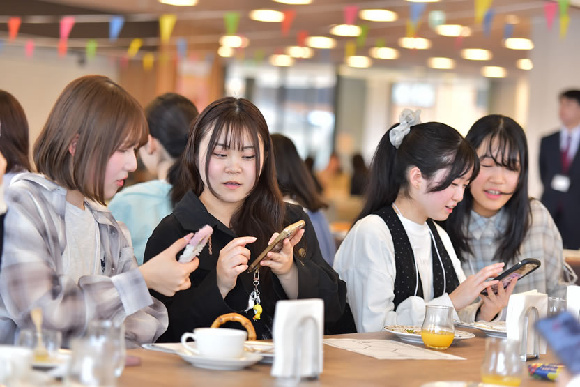先輩学生との懇親会では、学科別や趣味別に3回ローテションを行い、新入生たちは中心となった先輩スタッフと交流しました。大学生活の不安や悩みをはじめ、授業や勉強のこと、部活動・サークル活動についてなど、様々な相談をしていました。新入生同士もすぐに打ち解け、美味しいケーキを囲みながら会話が弾み、会場には始終、明るく賑やかな笑顔があふれていました。