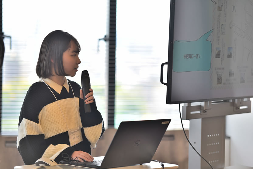 後半には、こまち会スタッフによる活動に関するプレゼンテーションが行われ、昨年度に制作した大学周辺マップや、こまち会のイメージキャラクター、広告などについて紹介がありました。