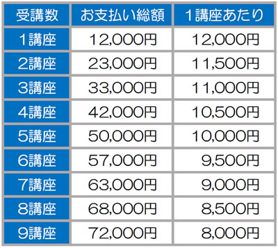 企業、団体はもちろん、個人のグループでも取りまとめの代表者がいる場合には、受講科目数に応じた受講料割引を適用します。